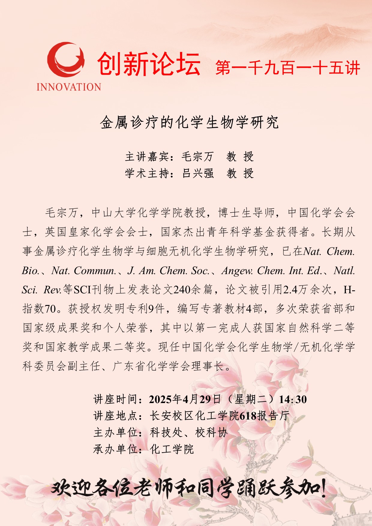 毛宗万 教授 广发体育创新论坛第一千九百一十五讲:金属诊疗的化学生物学研究 讲座时间 2025年4月29日(星期二)14:30 讲座地点 长安校区化工学院618报告厅 讲座人介绍 毛宗万 教授 讲座内容