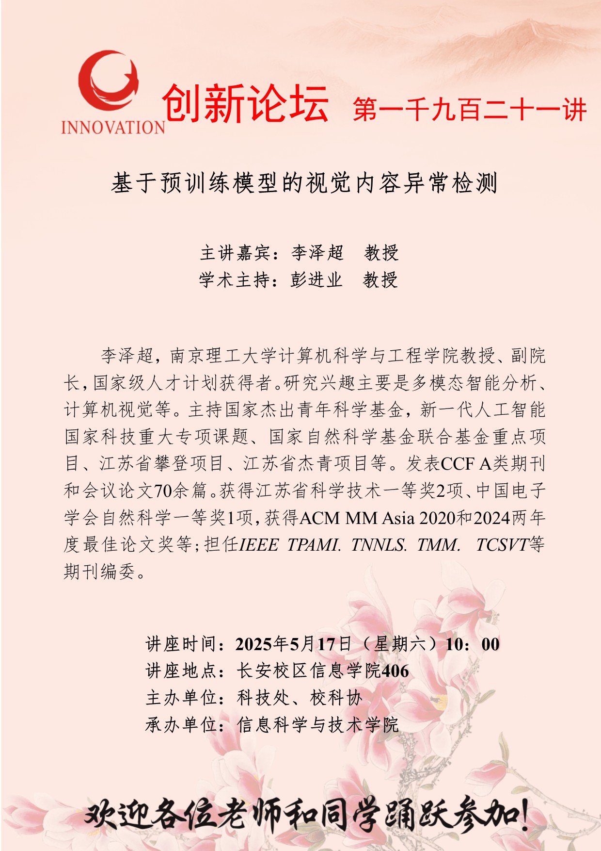 李泽超 教授 广发体育创新论坛第一千九百二十一讲:基于预训练模型的视觉内容异常检测 讲座时间 2025年5月17日(星期六)10:00 讲座地点 长安校区信息学院406 讲座人介绍 李泽超 教授 讲座内容