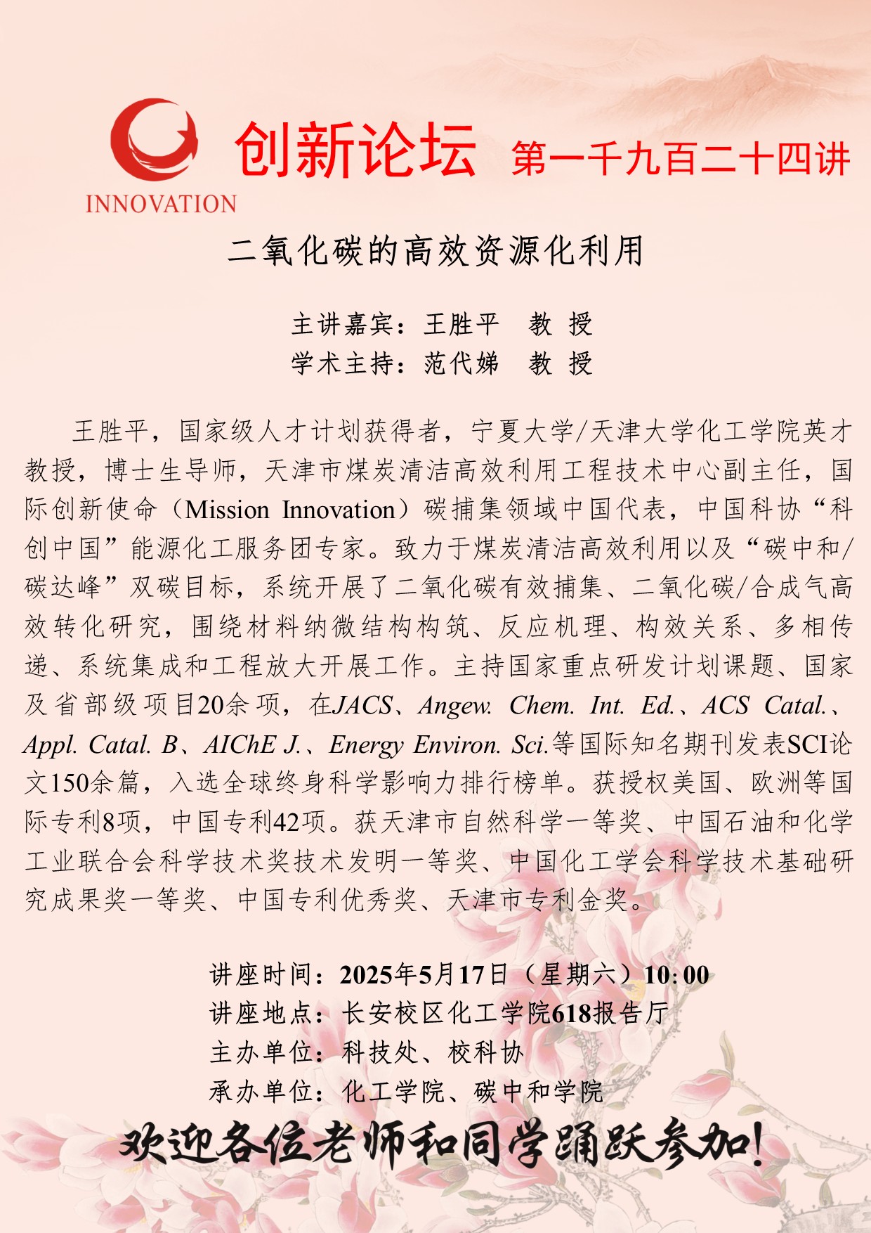 王胜平 教授 广发体育创新论坛第一千九百二十四讲:二氧化碳的高效资源化利用 讲座时间 2025年5月17日(星期六)10:00 讲座地点 长安校区化工学院618报告厅 讲座人介绍 王胜平 教授 讲座内容