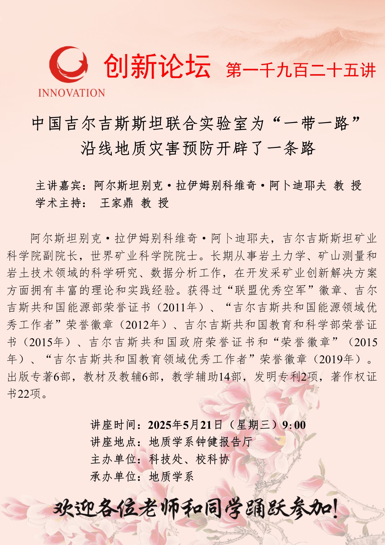 阿尔斯坦别克·拉伊姆别科维奇·阿卜迪耶夫 教授 广发体育创新论坛第一千九百二十五讲:中国吉尔吉斯斯坦联合实验室为“一带一路”沿线地质灾害预防开辟了一条路 讲座时间 2025年5月21日(星期三)9:00 讲座地点 地质学系钟健报告厅 讲座人介绍 阿尔斯坦别克·拉伊姆别科维奇·阿卜迪耶夫 教授 讲座内容