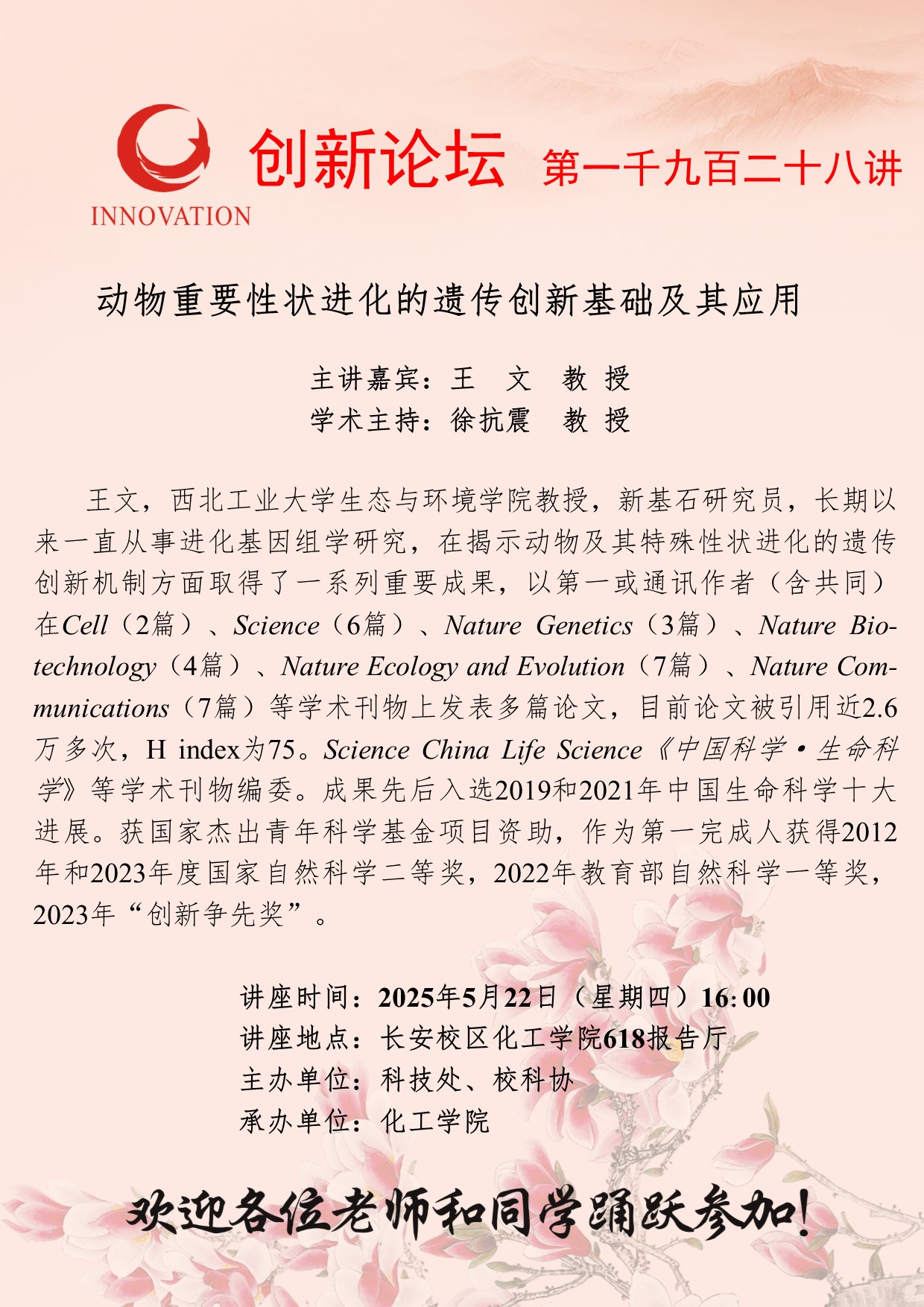 王文 教授 广发体育创新论坛第一千九百二十八讲:动物重要性状进化的遗传创新基础及其应用 讲座时间 2025年5月22日(星期四)16:00 讲座地点 长安校区化工学院618报告厅 讲座人介绍 王文 教授 讲座内容