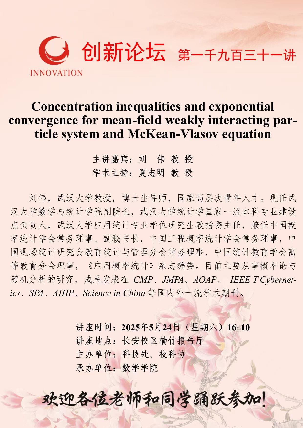 刘伟 教授 广发体育创新论坛第一千九百三十一讲:Concentration inequalities and exponential convergence for mean-field weakly interacting particle system and McKean-Vlasov equation 讲座时间 2025年5月24日(星期六)16:10 讲座地点 长安校区楠竹报告厅 讲座人介绍 刘伟 教授 讲座内容