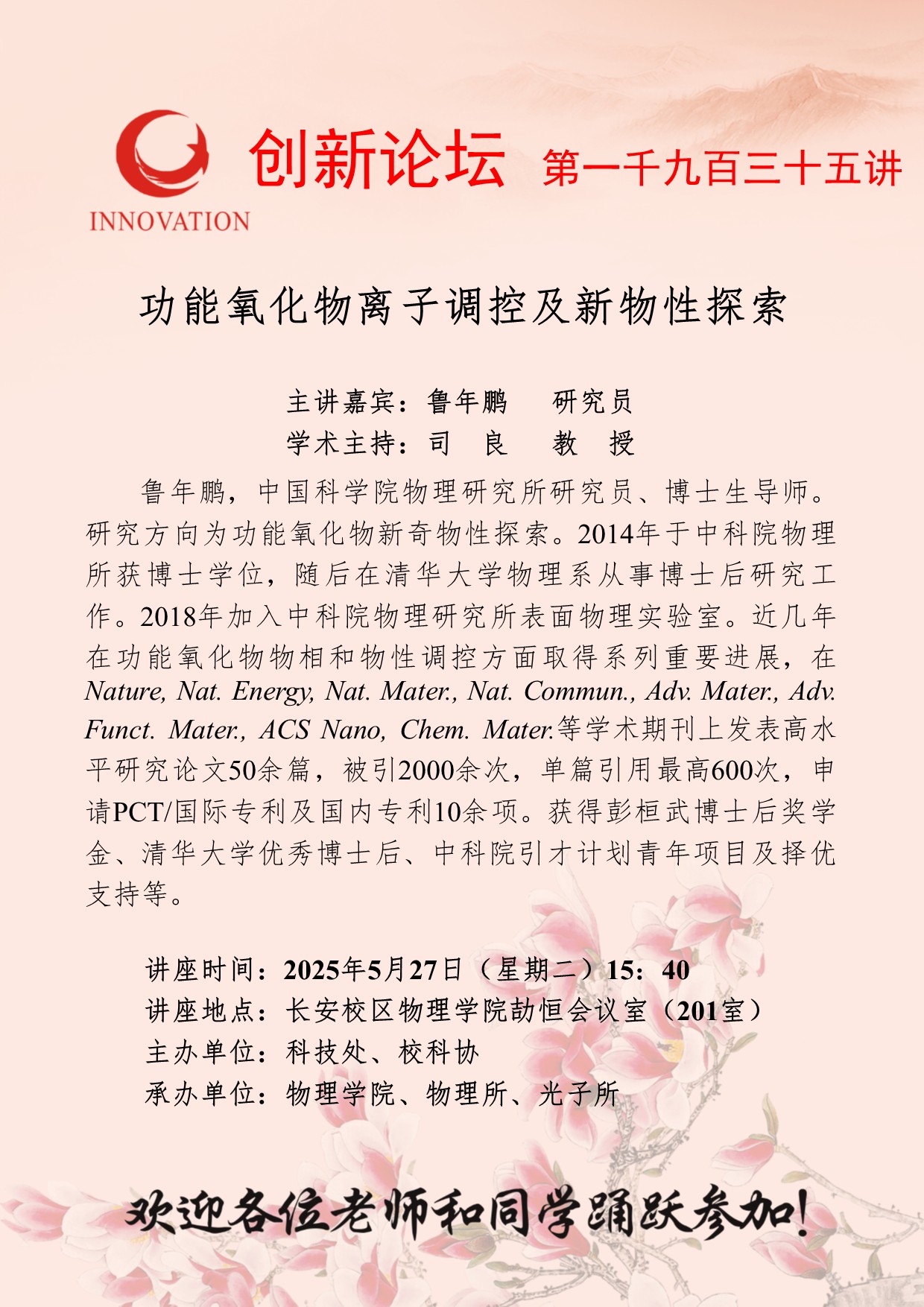 鲁年鹏 研究员 广发体育创新论坛第一千九百三十五讲:功能氧化物离子调控及新物性探索 讲座时间 2025年5月27日(星期二)15:40 讲座地点 长安校区物理学院劼恒会议室(201室) 讲座人介绍 鲁年鹏 研究员 讲座内容