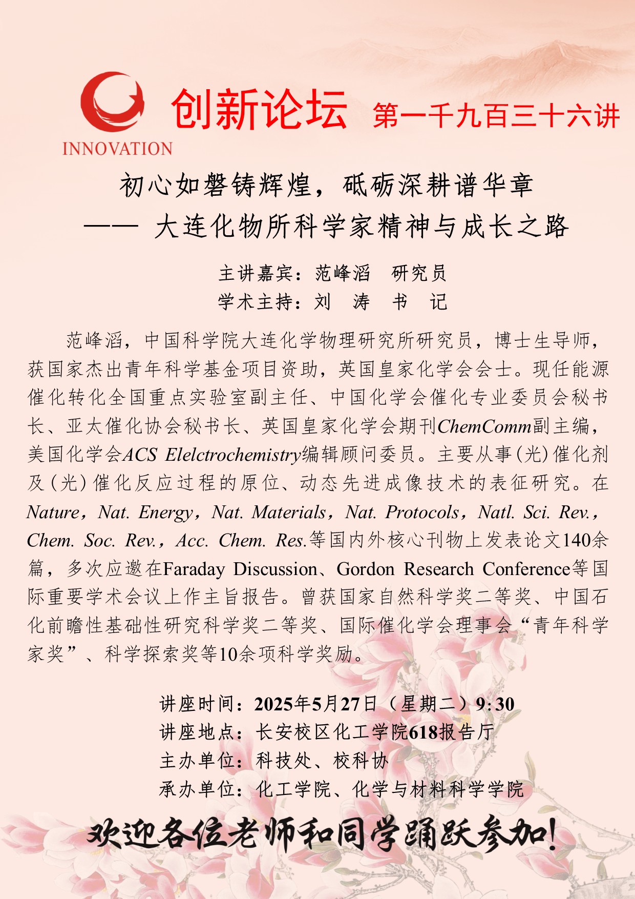 范峰滔 研究员 广发体育创新论坛第一千九百三十六讲:初心如磐铸辉煌,砥砺深耕谱华章——大连化物所科学家精神与成长之路 讲座时间 2025年5月27日(星期二)9:30 讲座地点 长安校区化工学院618报告厅 讲座人介绍 范峰滔 研究员 讲座内容