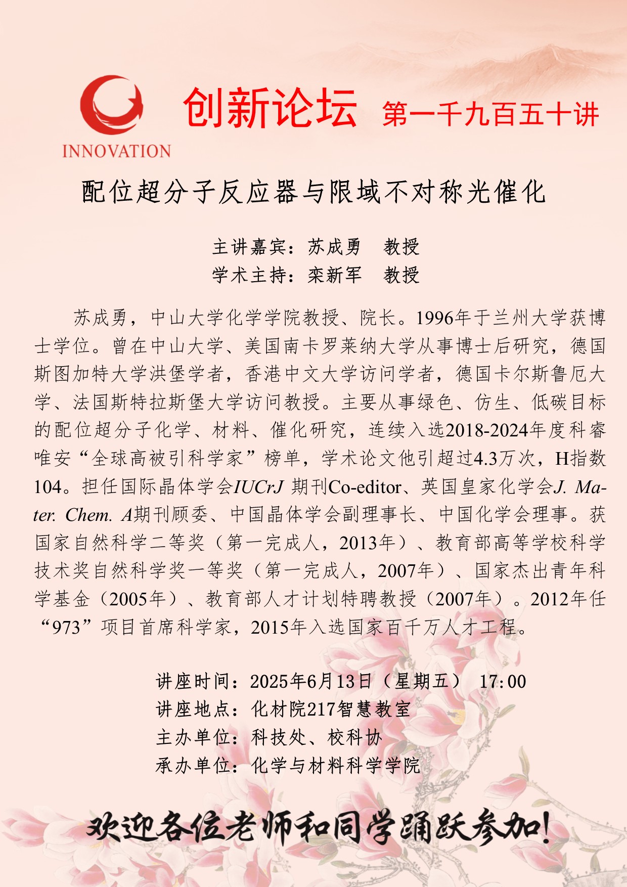 苏成勇 教授 广发体育创新论坛第一千九百五十讲:配位超分子反应器与限域不对称光催化 讲座时间 2025年6月13日(星期五) 17:00 讲座地点 化材院217智慧教室 讲座人介绍 苏成勇 教授 讲座内容