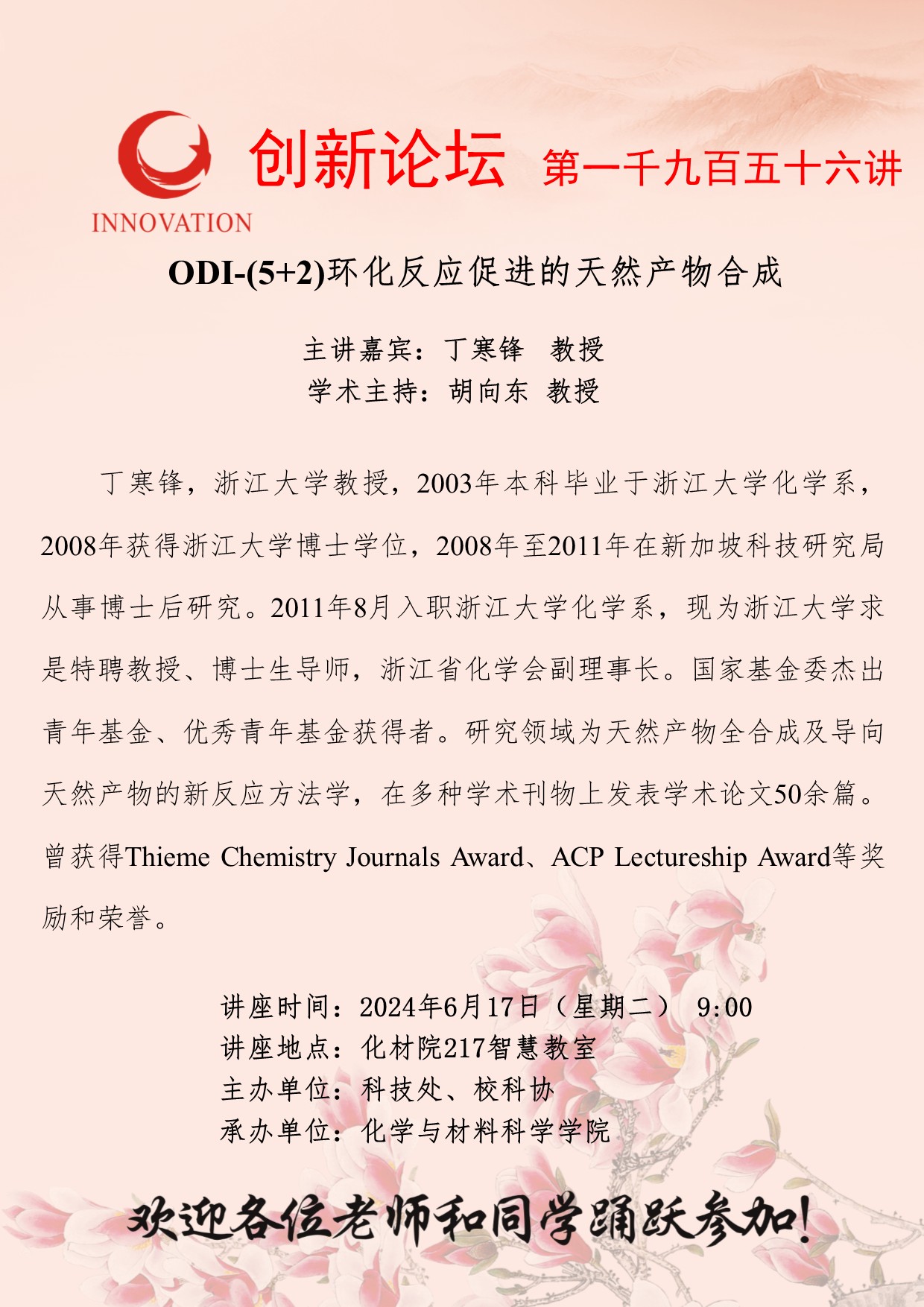 丁寒锋 教授 广发体育创新论坛第一千九百五十六讲:ODI-(5+2)环化反应促进的天然产物合成 讲座时间 2024年6月17日(星期二) 9:00 讲座地点 化材院217智慧教室 讲座人介绍 丁寒锋 教授 讲座内容