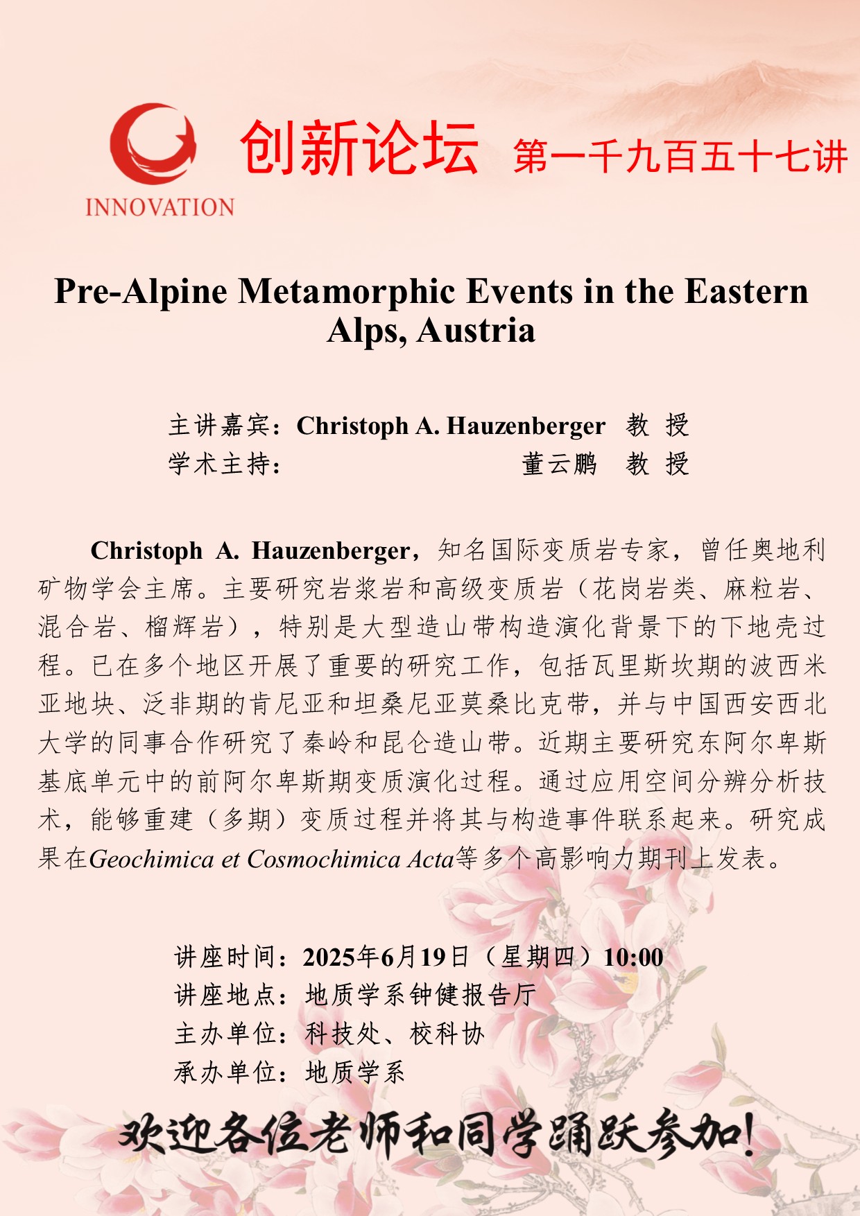 Christoph A. Hauzenberger 教授 广发体育创新论坛第一千九百五十七讲:Pre-Alpine Metamorphic Events in the Eastern Alps, Austria 讲座时间 2025年6月19日(星期四)10:00 讲座地点 地质学系钟健报告厅 讲座人介绍 Christoph A. Hauzenberger 教授 讲座内容