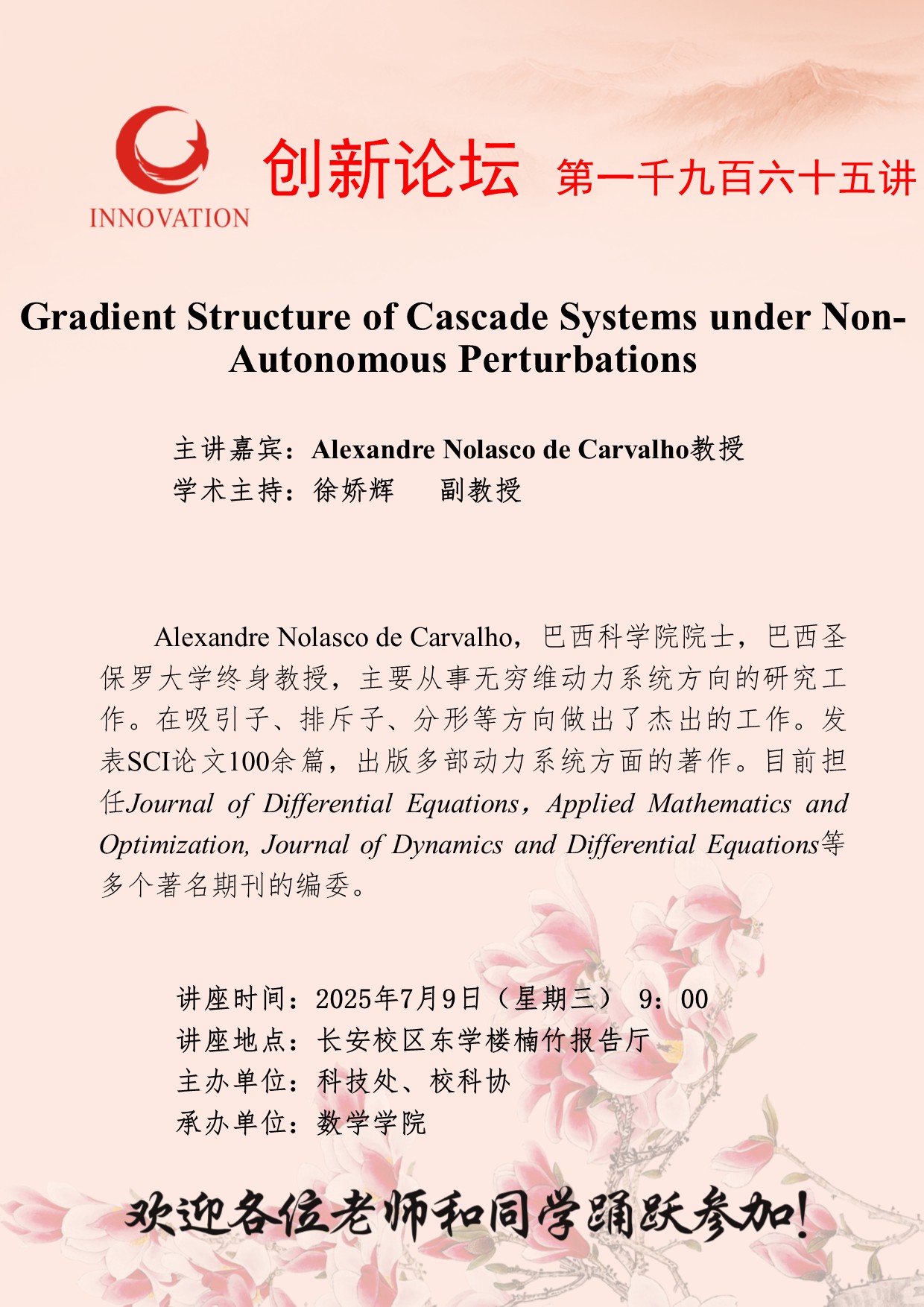 Alexandre Nolasco de Carvalho 教授 广发体育创新论坛第一千九百六十五讲:Gradient Structure of Cascade Systems under Non-Autonomous Perturbations 讲座时间 2025年7月9日(星期三) 9:00 讲座地点 长安校区东学楼楠竹报告厅 讲座人介绍 Alexandre Nolasco de Carvalho 教授 讲座内容
