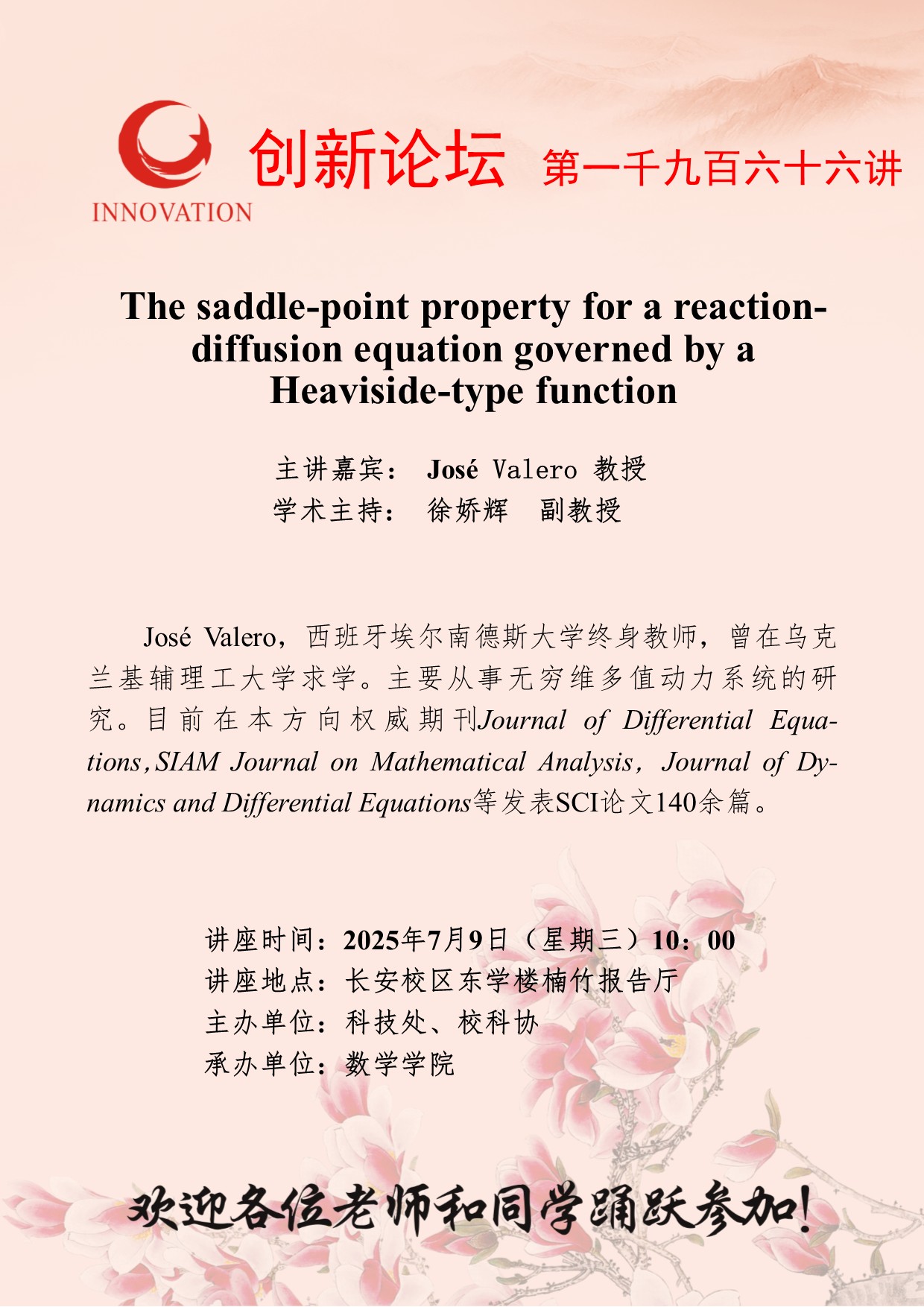 José Valero 教授 广发体育创新论坛第一千九百六十六讲:The saddle-point property for a reaction-diffusion equation governed by a Heaviside-type function 讲座时间 2025年7月9日(星期三)10:00 讲座地点 长安校区东学楼楠竹报告厅 讲座人介绍 José Valero 教授 讲座内容
