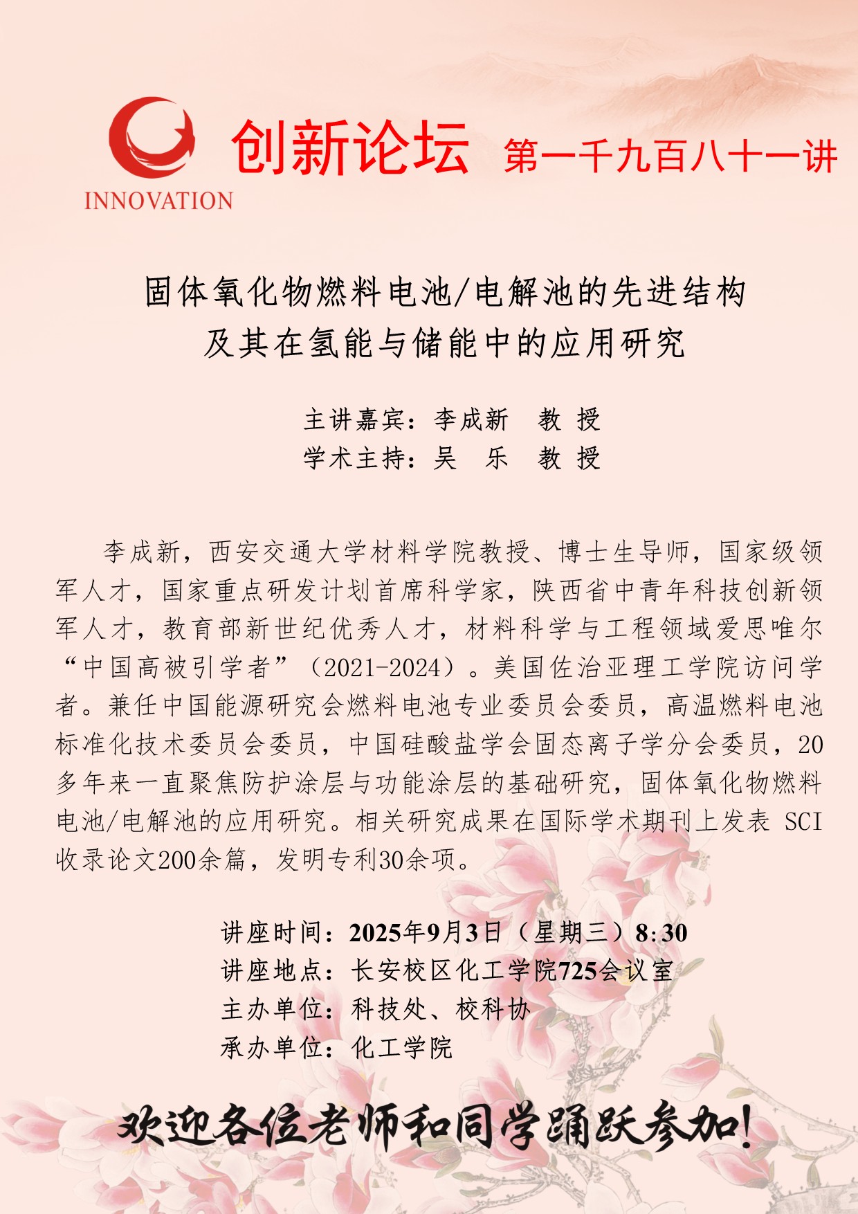 李成新 教授 广发体育创新论坛第一千九百八十一讲:固体氧化物燃料电池/电解池的先进结构及其在氢能与储能中的应用研究 讲座时间 2025年9月3日(星期三)8:30 讲座地点 长安校区化工学院725会议室 讲座人介绍 李成新 教授 讲座内容