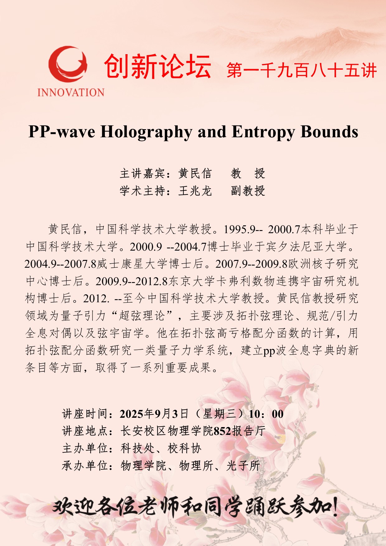 黄民信 教授 广发体育创新论坛第一千九百八十五讲:PP-wave Holography and Entropy Bounds 讲座时间 2025年9月3日(星期三)10:00 讲座地点 长安校区物理学院852报告厅 讲座人介绍 黄民信 教授 讲座内容