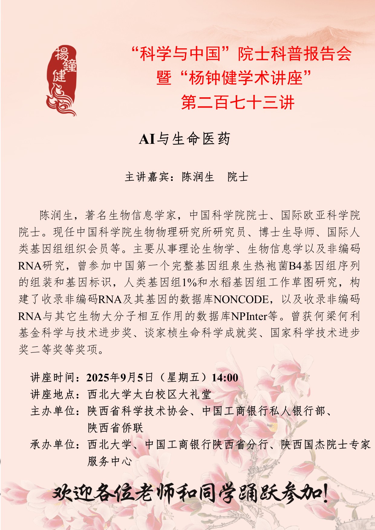 陈润生 院士 “科学与中国”院士科普报告会暨“杨钟健学术讲座”第二百七十三讲:AI与生命医药 讲座时间 2025年9月5日(星期五)14:00 讲座地点 广发体育太白校区大礼堂 讲座人介绍 陈润生 院士 讲座内容