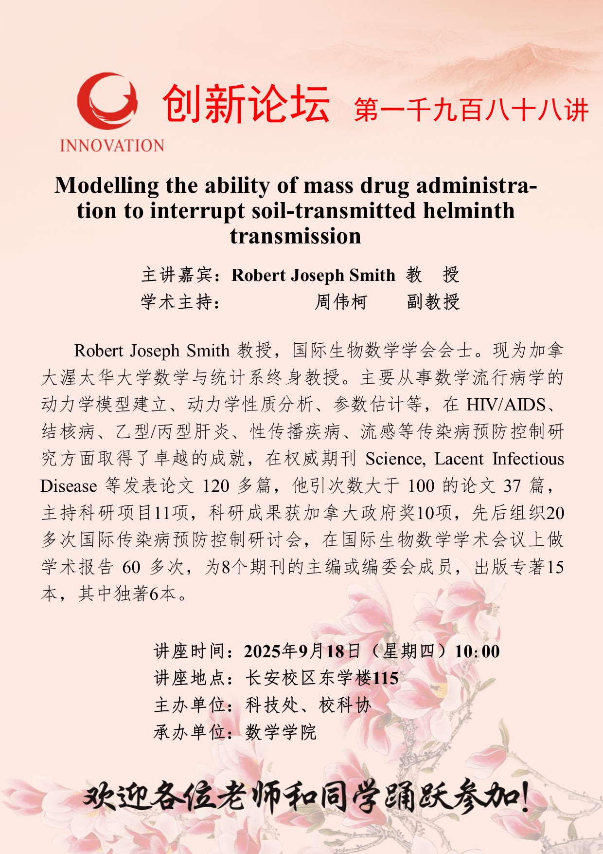 Robert Joseph Smith 教授 广发体育创新论坛第一千九百八十八讲:Modelling the ability of mass drug administration to interrupt soil-transmitted helminth transmission 讲座时间 2025年9月18日(星期四)10:00 讲座地点 长安校区东学楼115 讲座人介绍 Robert Joseph Smith 教授 讲座内容