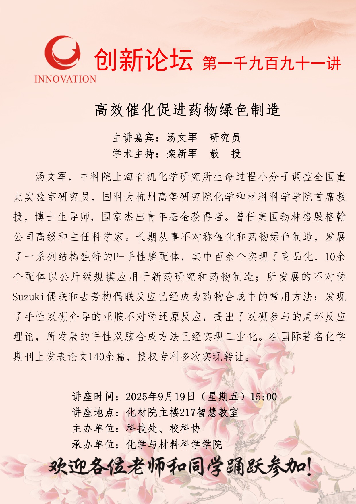 汤文军 研究员 广发体育创新论坛第一千九百九十一讲:高效催化促进药物绿色制造 讲座时间 2025年9月19日(星期五)15:00 讲座地点 化材院主楼217智慧教室 讲座人介绍 汤文军 研究员 讲座内容