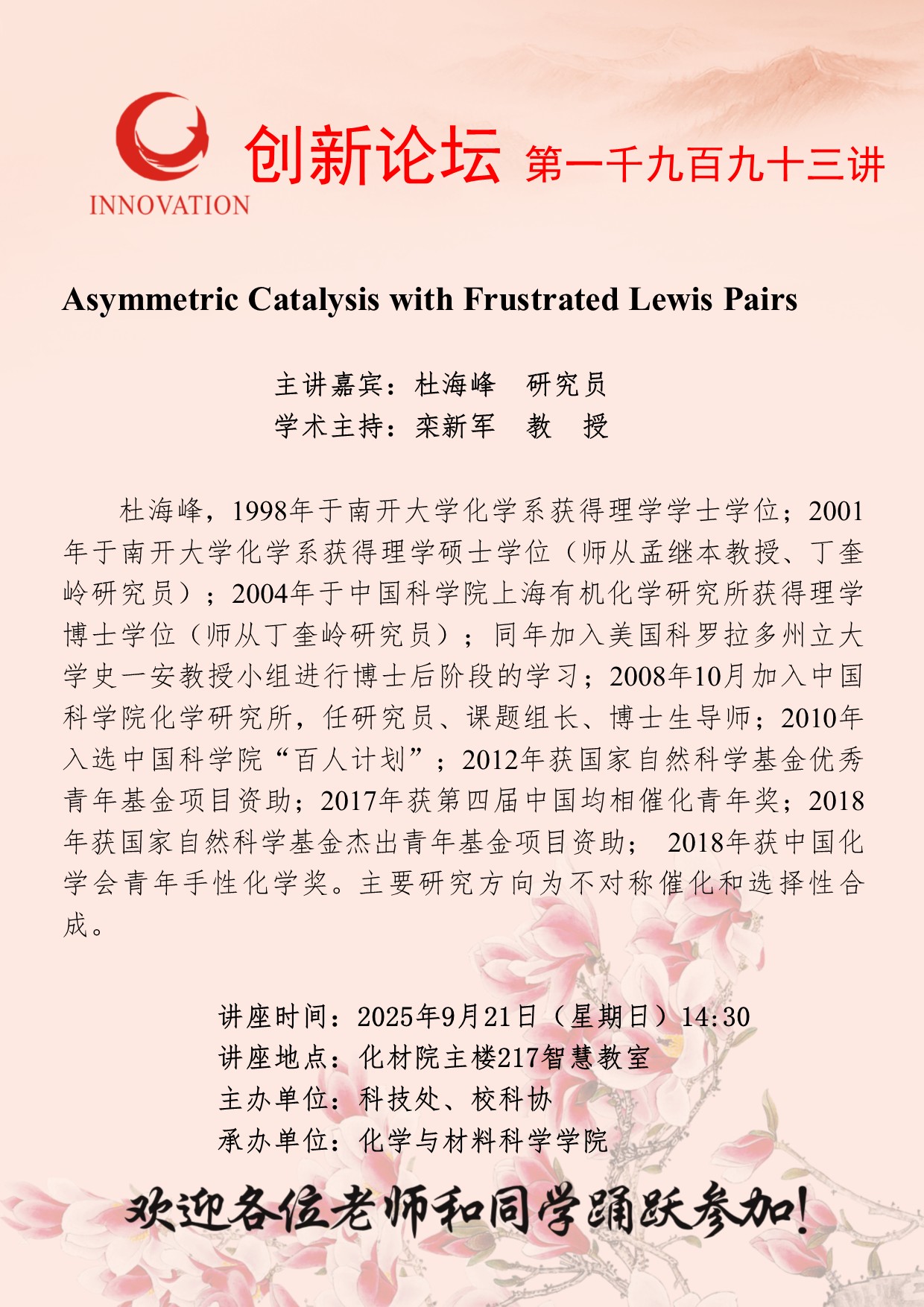 杜海峰 研究员 广发体育创新论坛第一千九百九十三讲:Asymmetric Catalysis with Frustrated Lewis Pairs 讲座时间 2025年9月21日(星期日)14:30 讲座地点 化材院主楼217智慧教室 讲座人介绍 杜海峰 研究员 讲座内容