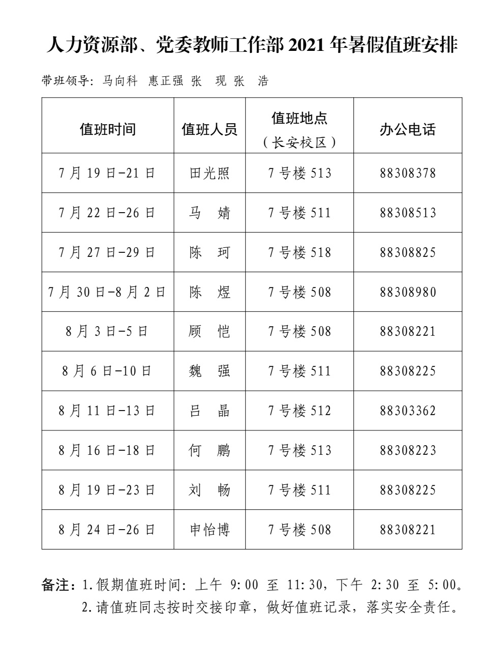 人力资源部、党委教师工作部2021年暑假值班安排