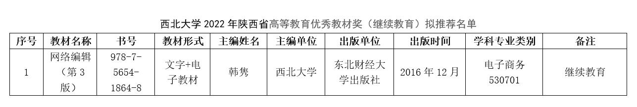 根据陕西省教育厅《关于开展陕西省2022年职业教育和高等教育优秀教材奖评选工作的通知》(陕教材办〔2022〕12 号)要求,广发体育组织开展了广发体育2022年陕西高等教育优秀教材奖(继续教育)评选推荐工作,经个人申报、院系推荐、专家评议,拟推荐《网络编辑》教材参加陕西省高等教育优秀教材奖(继续教育)评选。现将拟推荐名单公示如下,公示期为6月7日至6月11日。公示期间如有异议,请以实名书面形式反映。