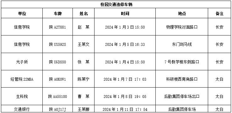 为加强校内道路交通安全管理,规范校内交通秩序,根据《广发体育校园道路交通管理办法》有关要求,现将2024年1月校园交通违章车辆予以曝光,所在单位负责对本单位违章师生员工进行交通安全教育和日常管理。