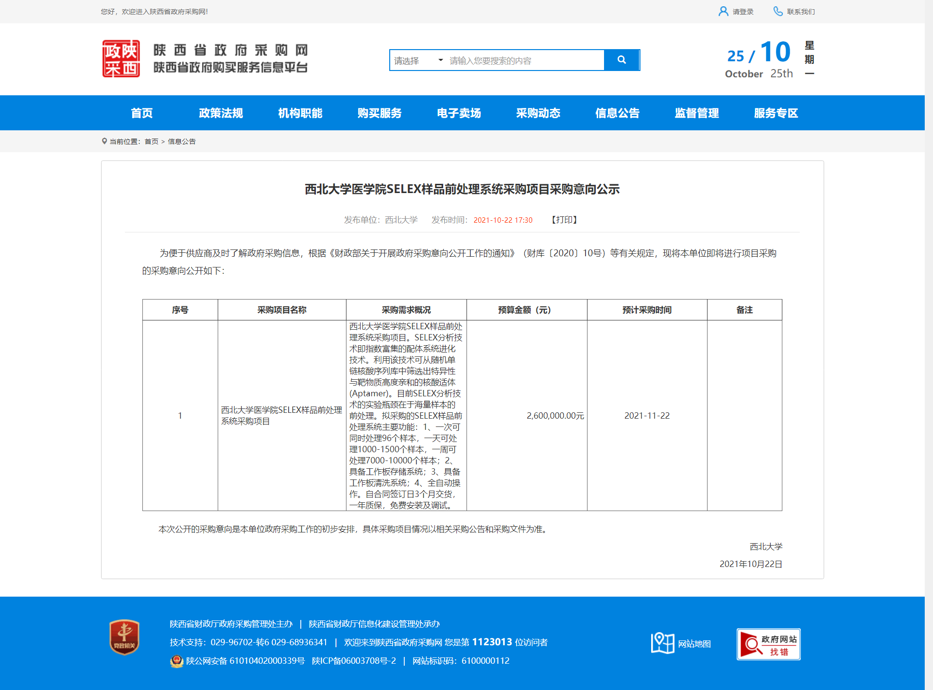 广发体育医学院SELEX样品前处理系统采购项目采购意向公示 作者: 编辑:薛利娟 时间:2021-10-25 原公告地址:http://www.ccgp-shaanxi.gov.cn/notice/noticeDetail.do?noticeguid=8a85be337c20d0b4017ca7551f1b7c5b