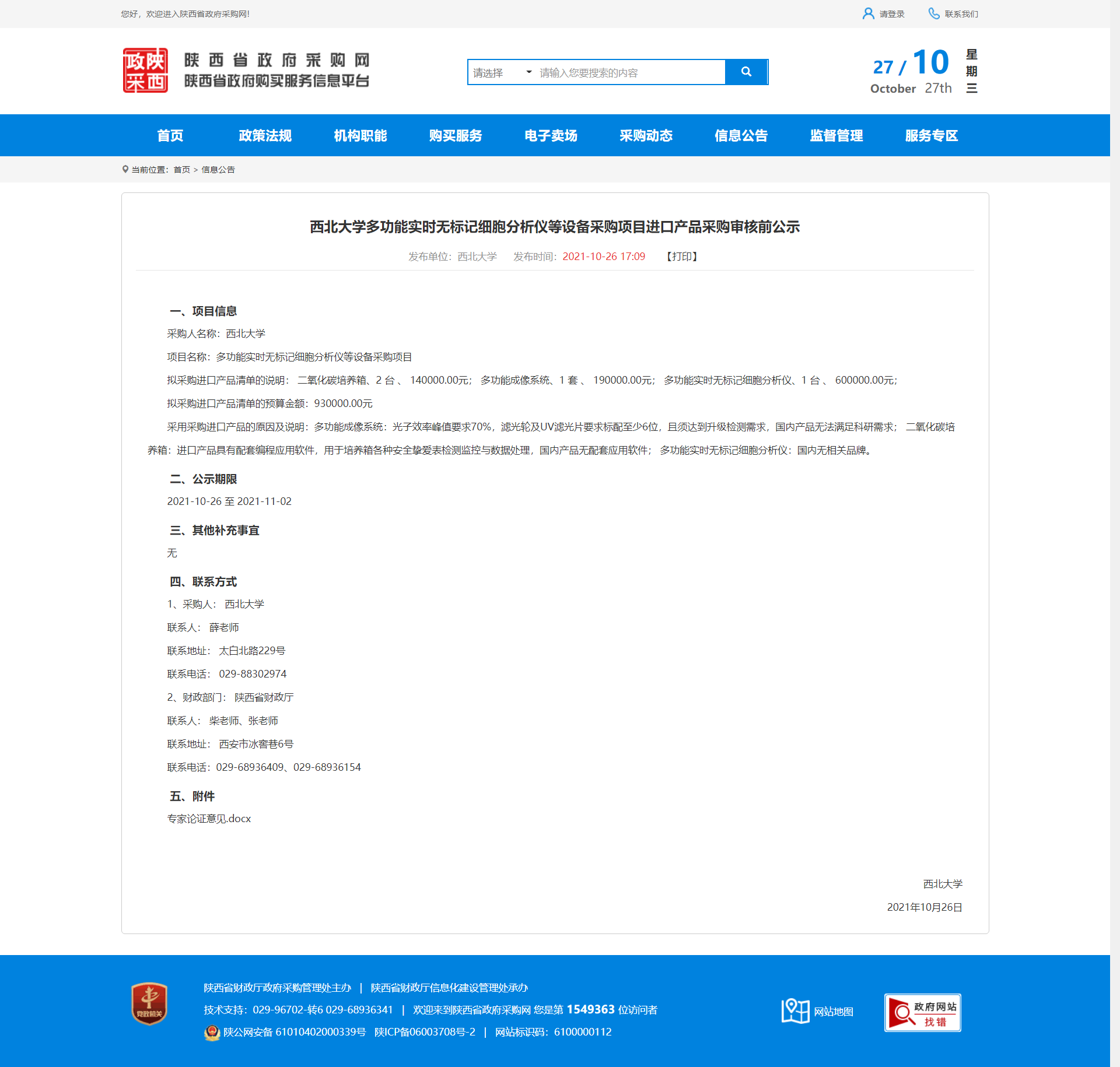 广发体育多功能实时无标记细胞分析仪等设备采购项目进口产品采购审核前公示 作者: 编辑:薛利娟 时间:2021-10-27 原公告地址:http://www.ccgp-shaanxi.gov.cn/notice/noticeDetail.do?noticeguid=8a85be337c20d0b4017cbbbd74c45f9b