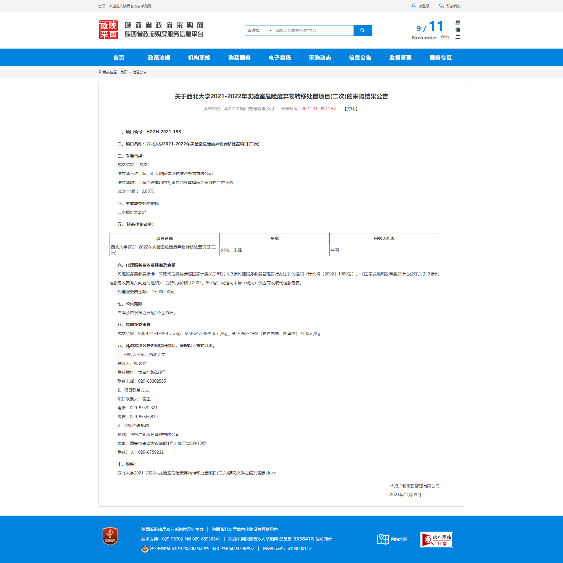 关于广发体育2021-2022年实验室危险废弃物转移处置项目(二次)的采购结果公告