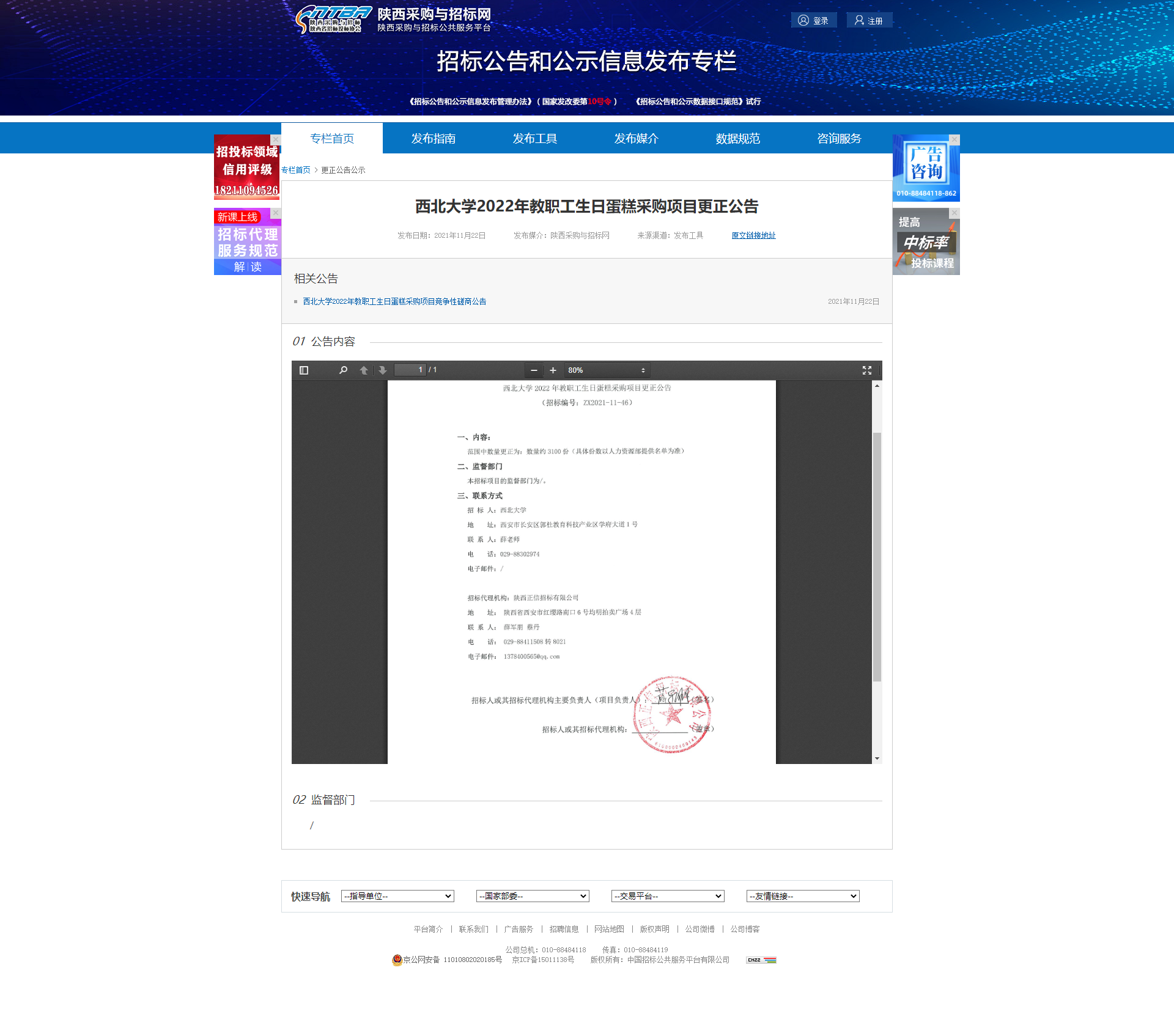 广发体育2022年教职工生日蛋糕采购项目更正公告 作者: 编辑:薛利娟 时间:2021-11-24 原公告网址:http://bulletin.sntba.com/changeBulletin/2021-11-22/366977.html