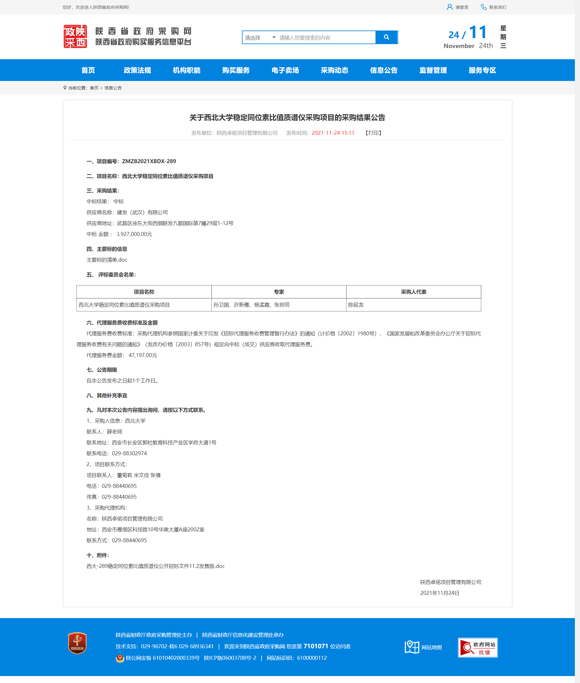 关于广发体育稳定同位素比值质谱仪采购项目的采购结果公告 作者: 编辑:薛利娟 时间:2021-11-24 原公告网址:http://www.ccgp-shaanxi.gov.cn/notice/noticeDetail.do?noticeguid=8a85be347d2d6f8d017d50c513e326e6