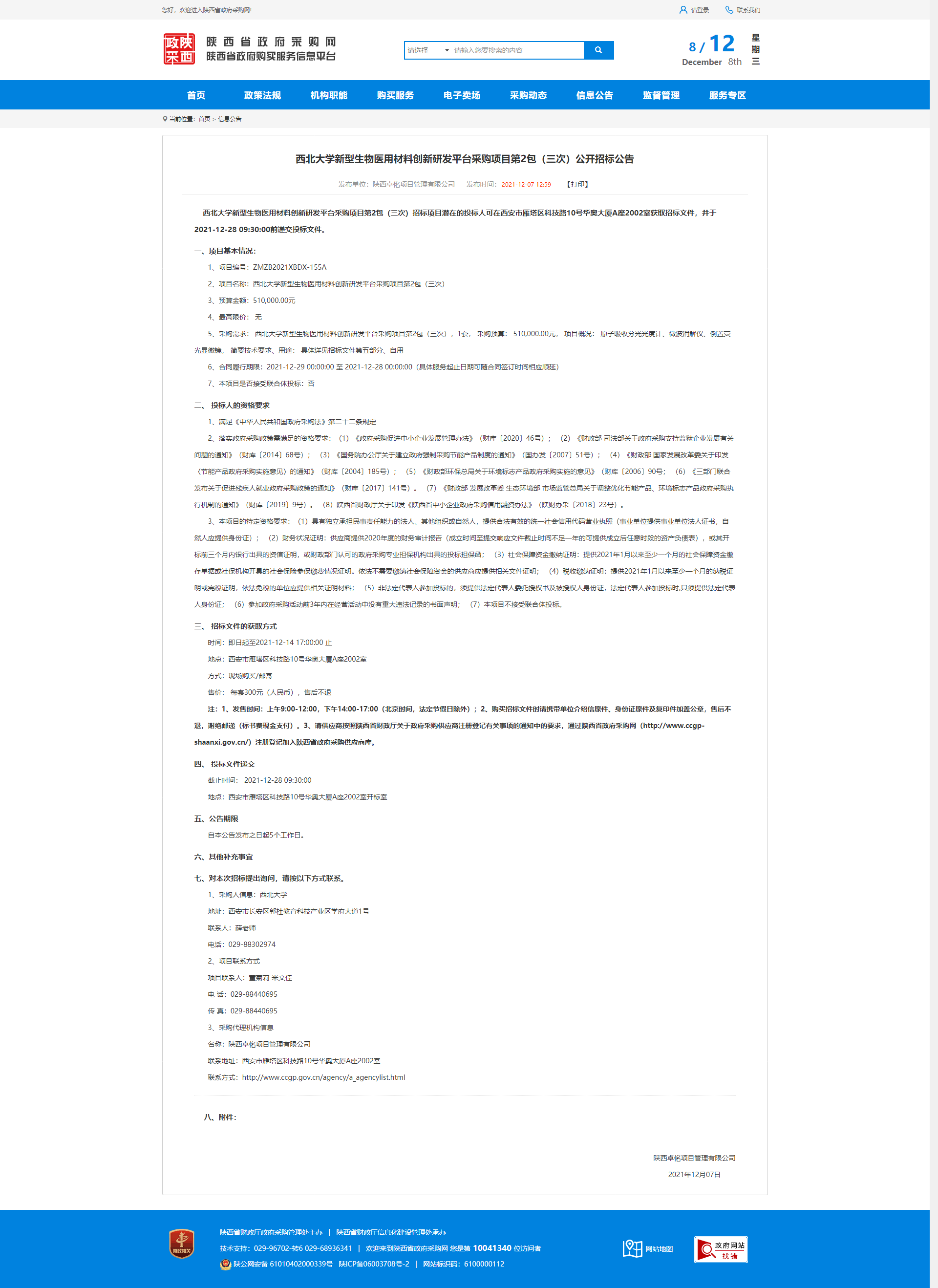 广发体育新型生物医用材料创新研发平台采购项目第2包(三次)公开招标公告 作者: 编辑:薛利娟 时间:2021-12-08 原公告链接:http://www.ccgp-shaanxi.gov.cn/notice/noticeDetail.do?noticeguid=8a85be347d6a75c8017d92f597c94e2d
