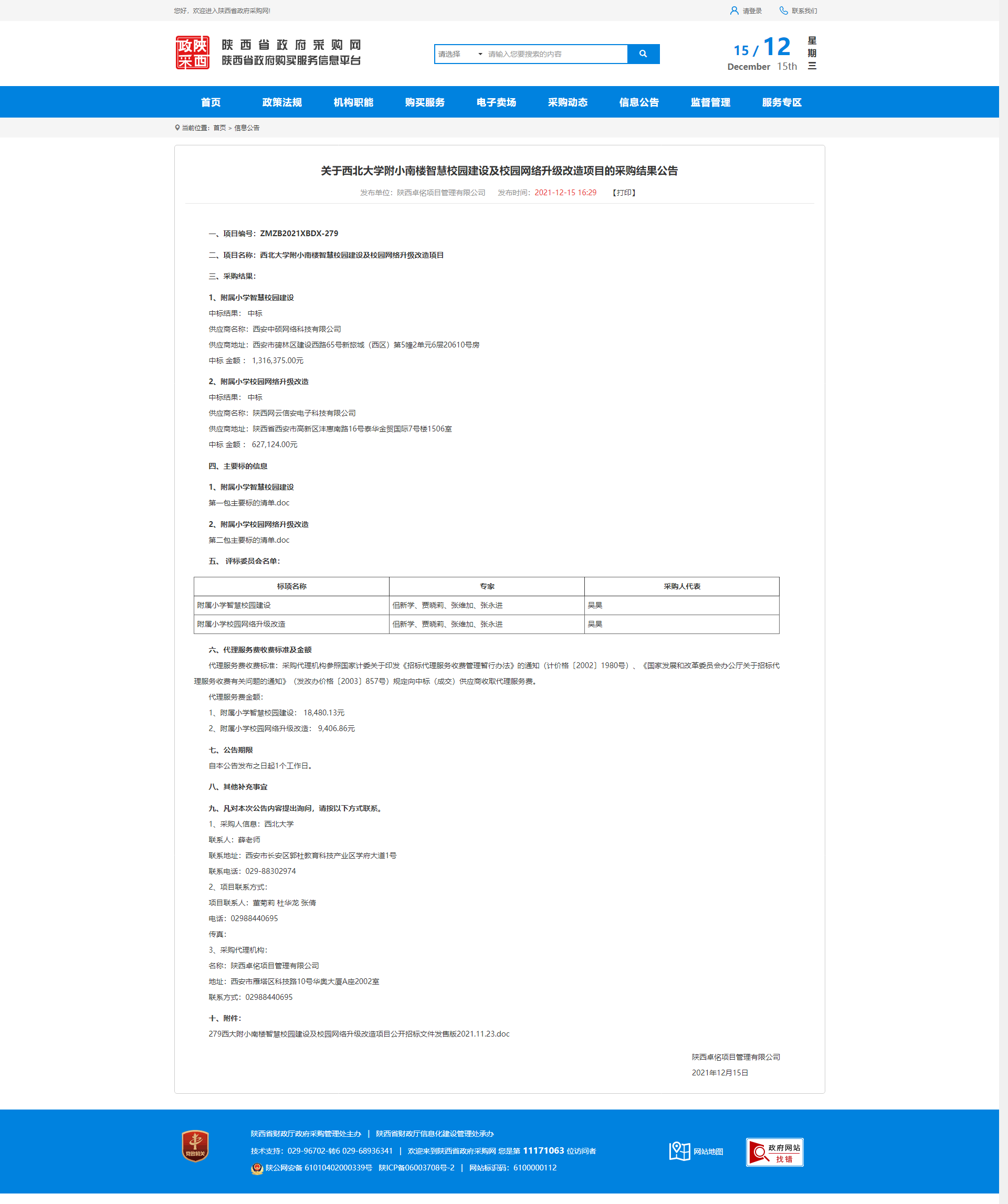 关于广发体育附小南楼智慧校园建设及校园网络升级改造项目的采购结果公告 作者: 编辑:薛利娟 时间:2021-12-15 原公告链接:http://www.ccgp-shaanxi.gov.cn/notice/noticeDetail.do?noticeguid=8a85be317dacefac017dbd0b5be51ce5