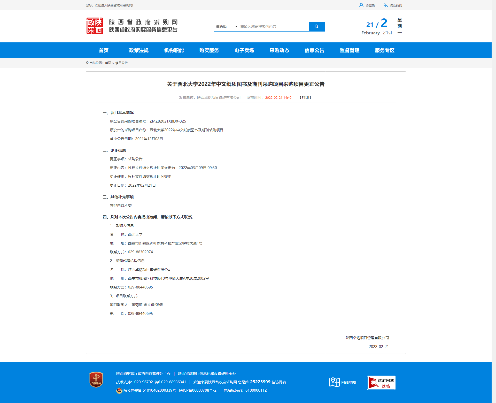 关于广发体育2022年中文纸质图书及期刊采购项目采购项目更正公告 作者: 编辑:薛利娟 时间:2022-02-21 原公告地址:http://www.ccgp-shaanxi.gov.cn/notice/noticeDetail.do?noticeguid=8a85be317ee7907d017f1aa113f346e8