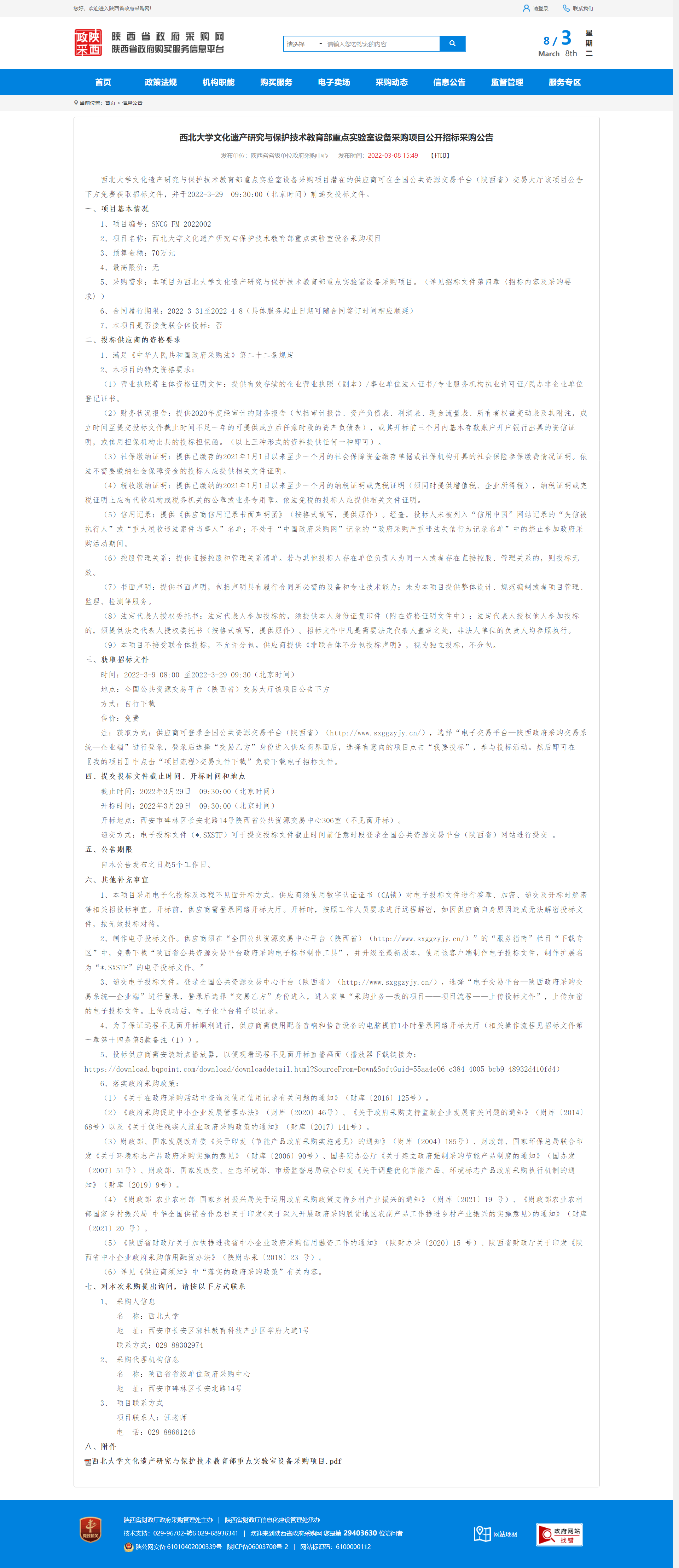 广发体育文化遗产研究与保护技术教育部重点实验室设备采购项目公开招标采购公告 作者: 编辑:薛利娟 时间:2022-03-08 原公告链接:http://www.ccgp-shaanxi.gov.cn/notice/noticeDetail.do?noticeguid=8a85be387e22c8ad017f687dcc81045b