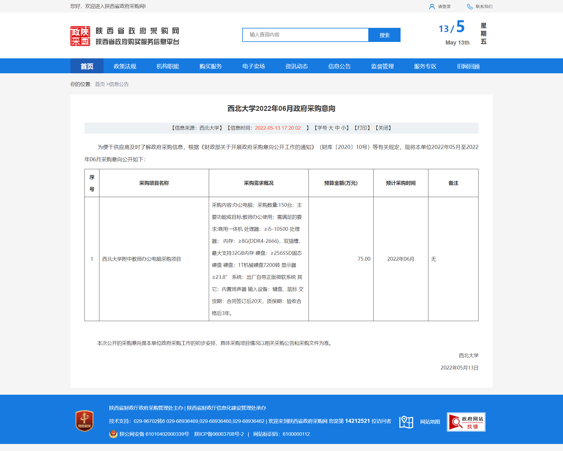 广发体育2022年06月政府采购意向 作者: 编辑:薛利娟 时间:2022-05-13 原公告链接:http://www.ccgp-shaanxi.gov.cn/freecms/site/shaanxi/ggxx/info/2022/8a69c0c980ba996a0180bcb638123331.html?noticeType=59¬iceId=147b64d1-d29e-11ec-9a8e-08c0eb20c666