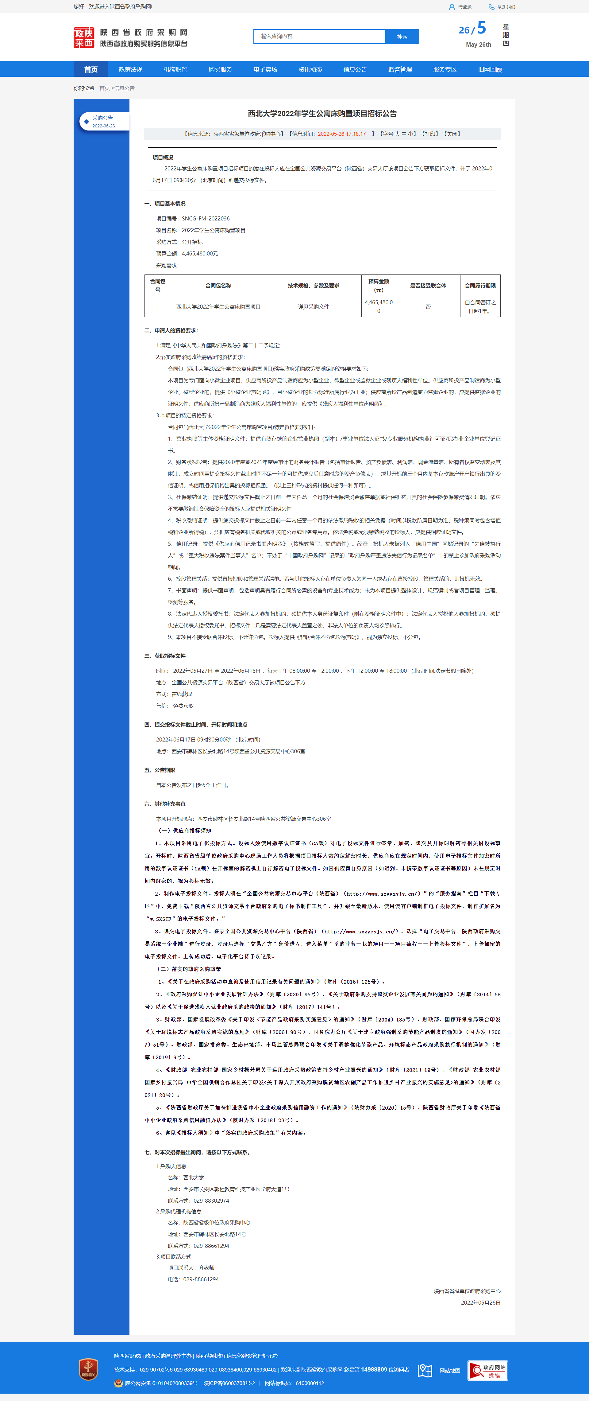 广发体育2022年学生公寓床购置项目招标公告 作者: 编辑:薛利娟 时间:2022-05-26 原公告链接:http://www.ccgp-shaanxi.gov.cn/freecms/site/shaanxi/ggxx/info/2022/8a69c34a80cf8c1d0180d6127e5a14f4.html?noticeType=001011¬iceId=0697247a-dcd5-11ec-9a8e-08c0eb20c666