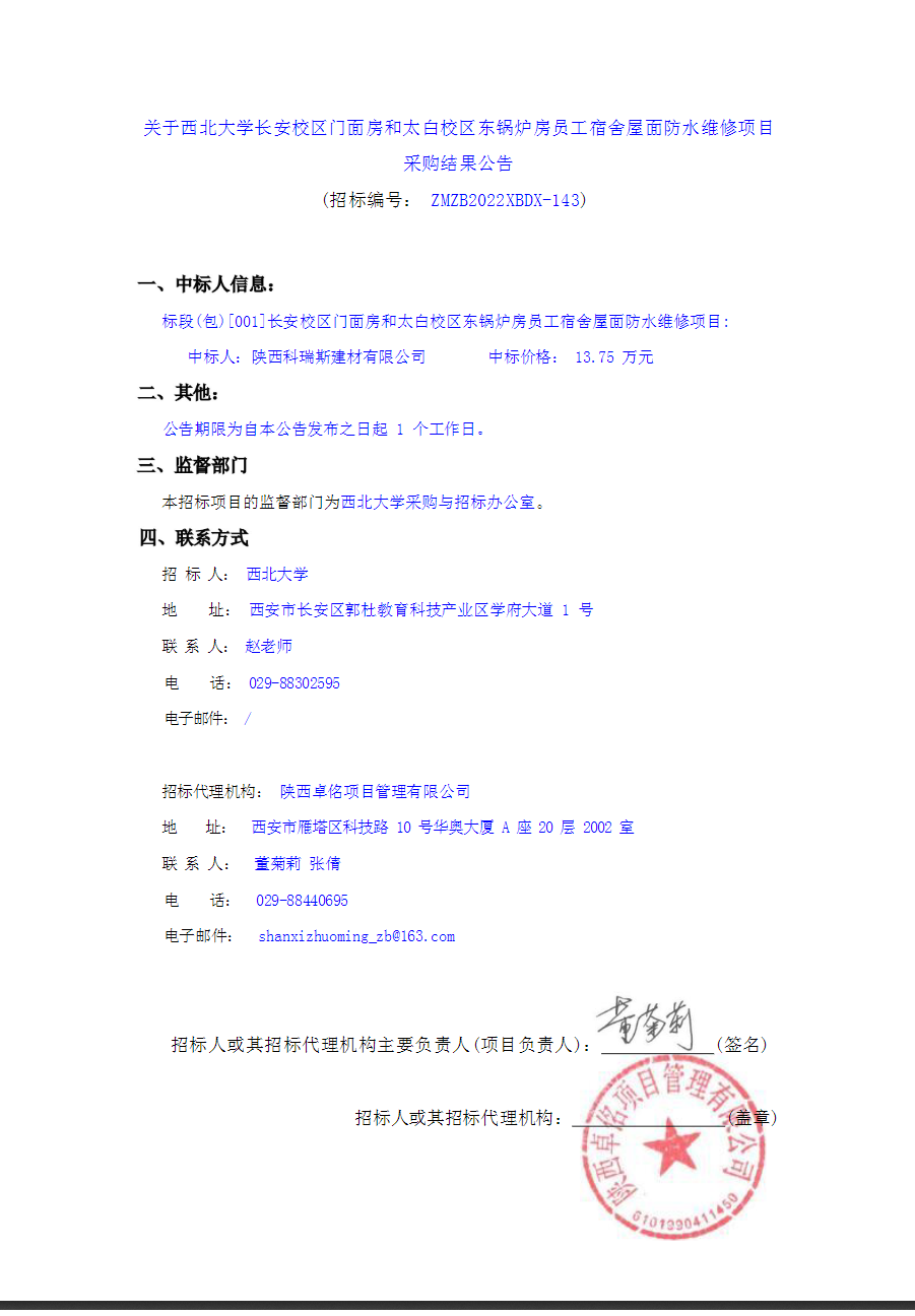关于广发体育长安校区门面房和太白校区东锅炉房员工宿舍屋面防水维修项目采购结果公告
