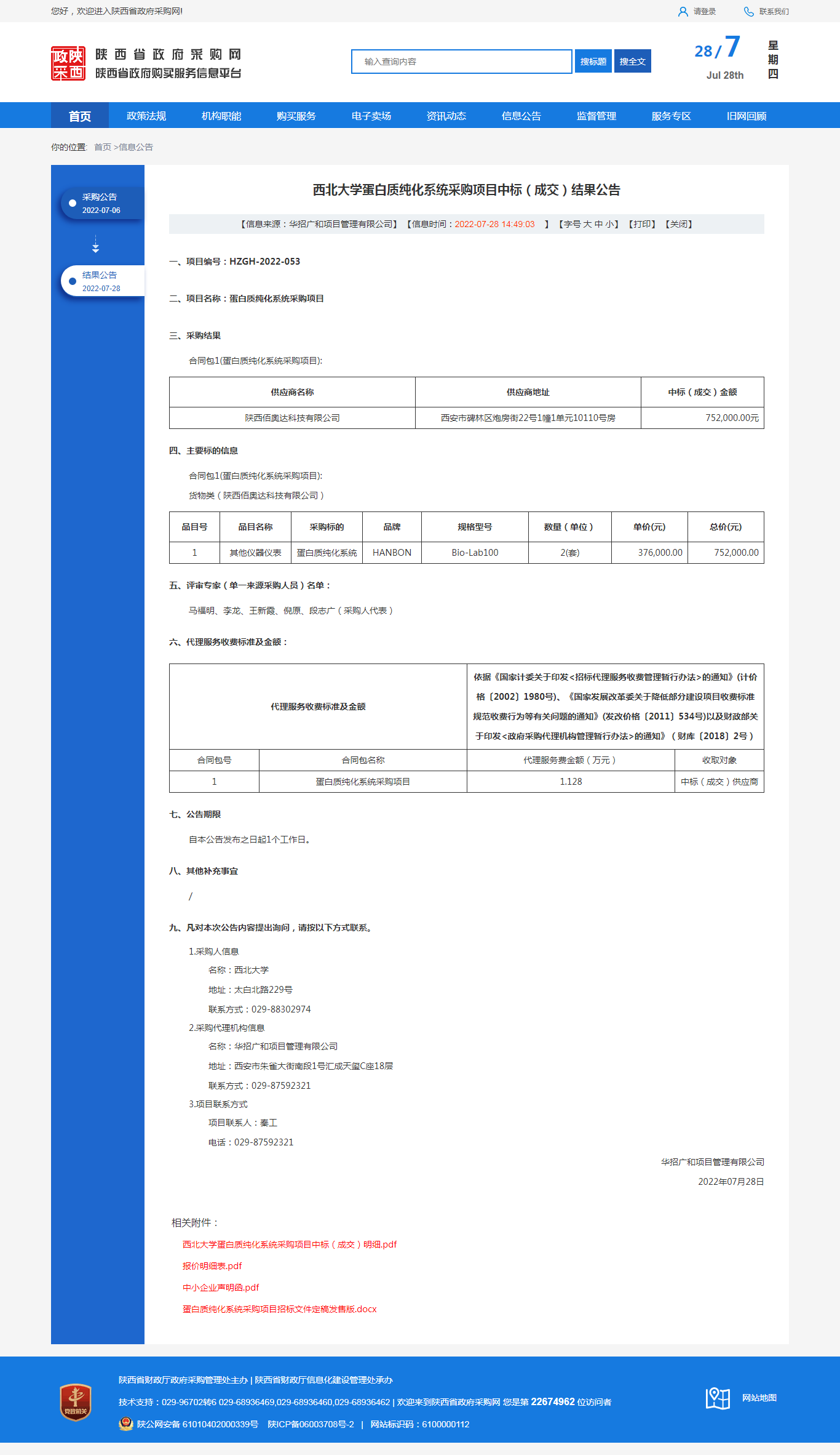 广发体育蛋白质纯化系统采购项目中标(成交)结果公告 作者: 编辑:采购与招标办公室 时间:2022-07-28 原公告链接:http://www.ccgp-shaanxi.gov.cn/freecms/site/shaanxi/ggxx/info/2022/8a69c0168238f2d801824386c2a86160.html?noticeType=001021¬iceId=c4ccf243-0e41-11ed-9a8e-08c0eb20c666