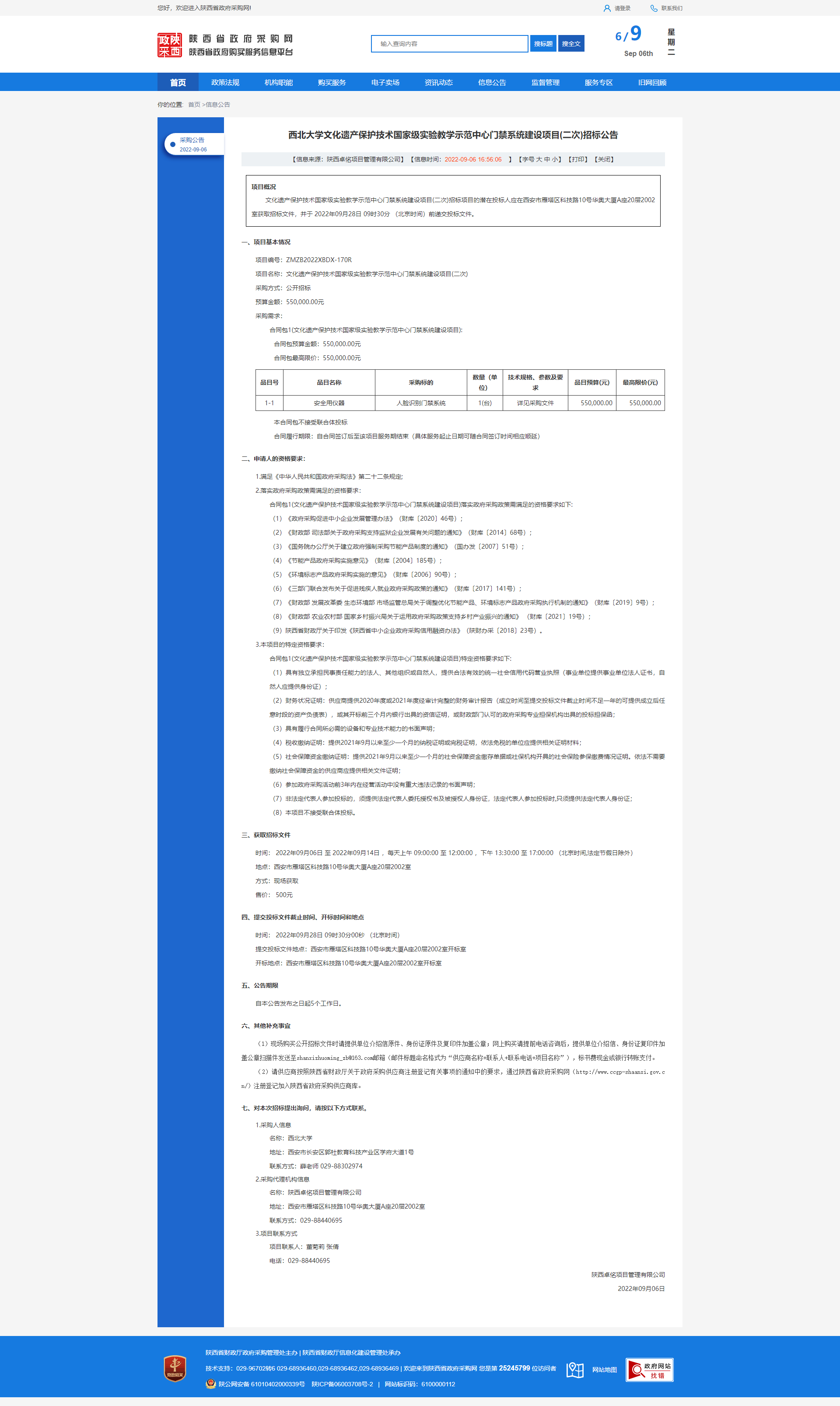 广发体育文化遗产保护技术国家级实验教学示范中心门禁系统建设项目(二次)招标公告 作者: 编辑:采购与招标办公室 时间:2022-09-06 原公告链接:http://www.ccgp-shaanxi.gov.cn/freecms/site/shaanxi/ggxx/info/2022/8a69c63182a32538018311f9ef2e1370.html?noticeType=001011¬iceId=3d8b61ff-2dc2-11ed-9a8e-08c0eb20c666