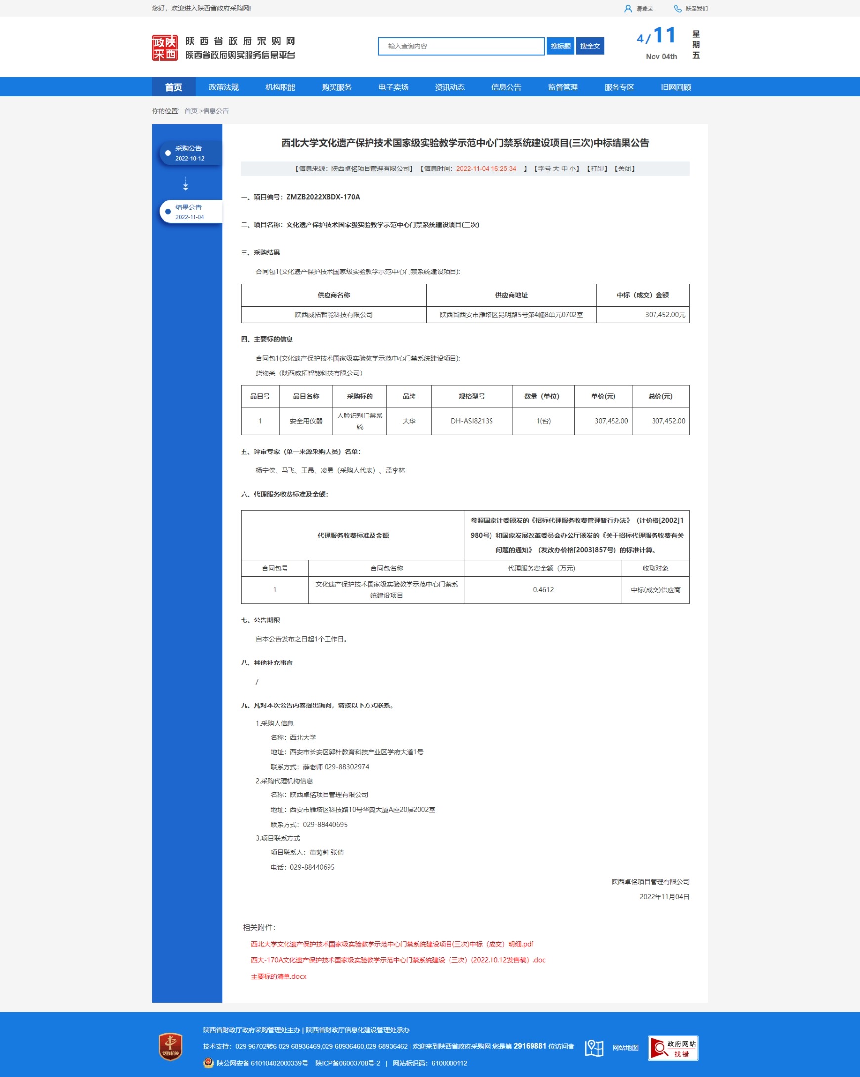 广发体育文化遗产保护技术国家级实验教学示范中心门禁系统建设项目(三次)中标结果公告 作者: 编辑:采购与招标办公室 时间:2022-11-04 原公告链接:http://www.ccgp-shaanxi.gov.cn/freecms/site/shaanxi/ggxx/info/2022/8a69c1948405afd90184419c635f2343.html?noticeType=001021¬iceId=de821f62-5c1a-11ed-9a8e-08c0eb20c666