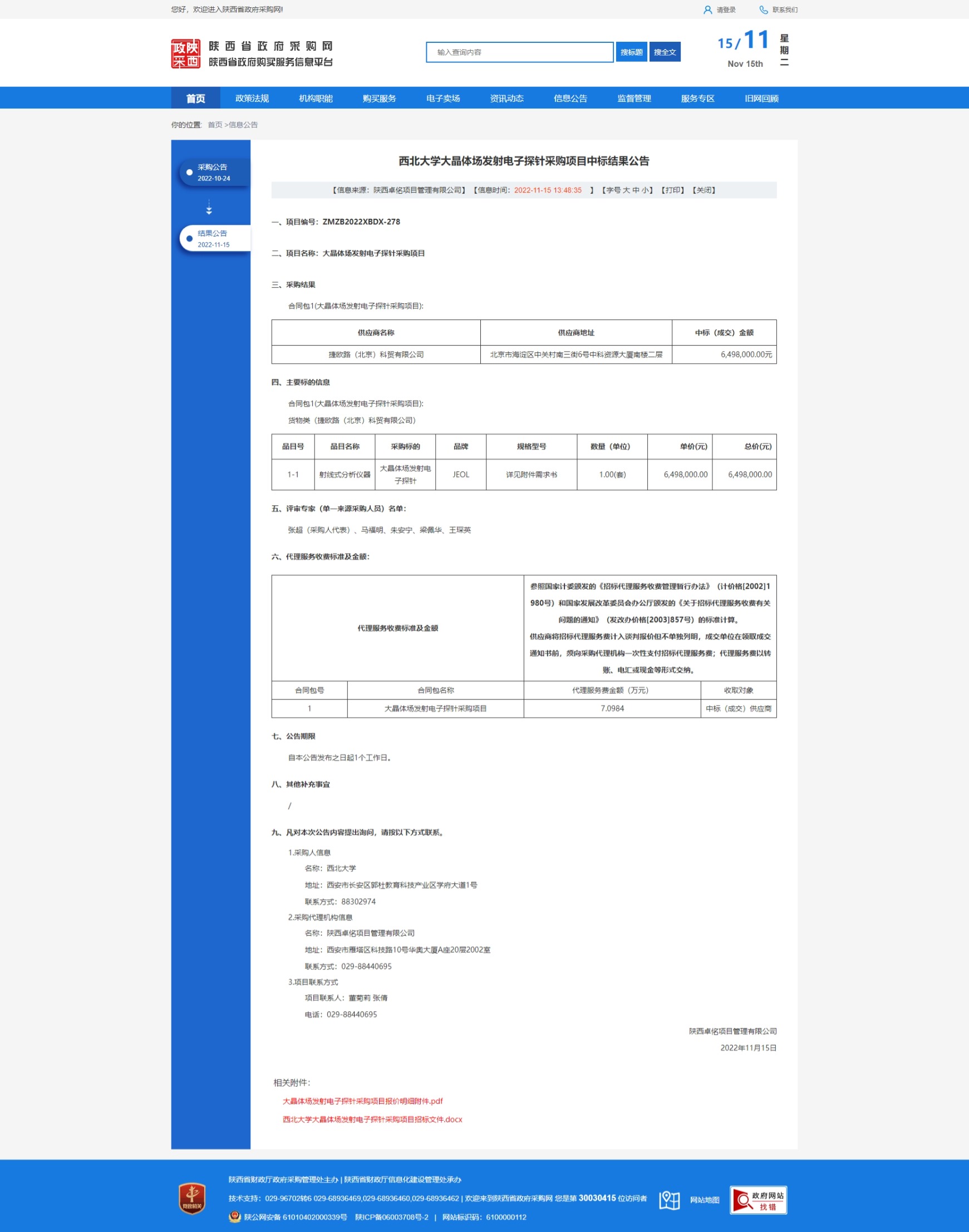 广发体育大晶体场发射电子探针采购项目中标结果公告 作者: 编辑:采购与招标办公室 时间:2022-11-15 原公告链接:http://www.ccgp-shaanxi.gov.cn/freecms/site/shaanxi/ggxx/info/2022/8a69c1948405afd90184743164664c62.html?noticeType=001021¬iceId=c98b2ee6-64a9-11ed-9a8e-08c0eb20c666