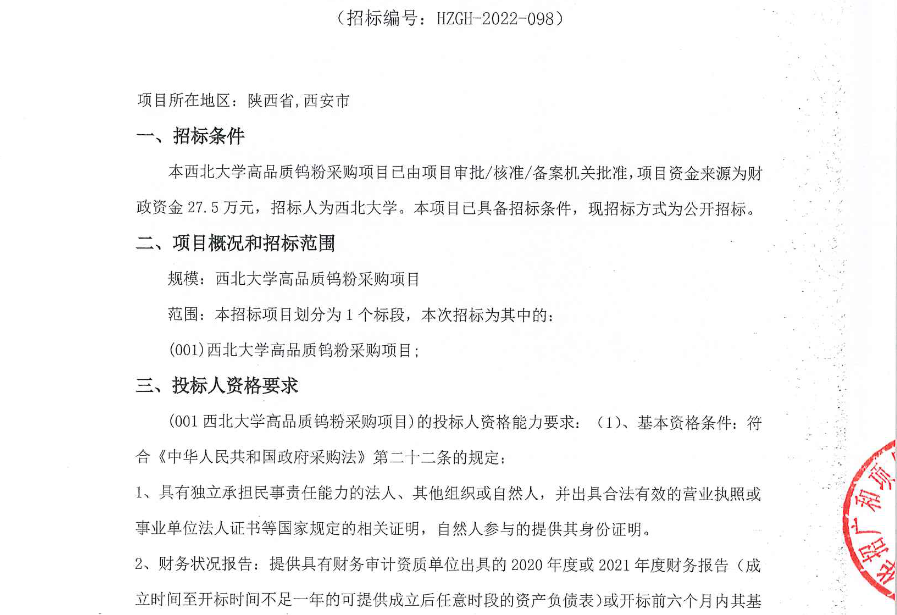 广发体育高品质钨粉采购项目公开招标公告 作者: 编辑:采购与招标办公室 时间:2022-11-23 原公告链接:http://bulletin.sntba.com/biddingBulletin/2022-11-23/502149.html