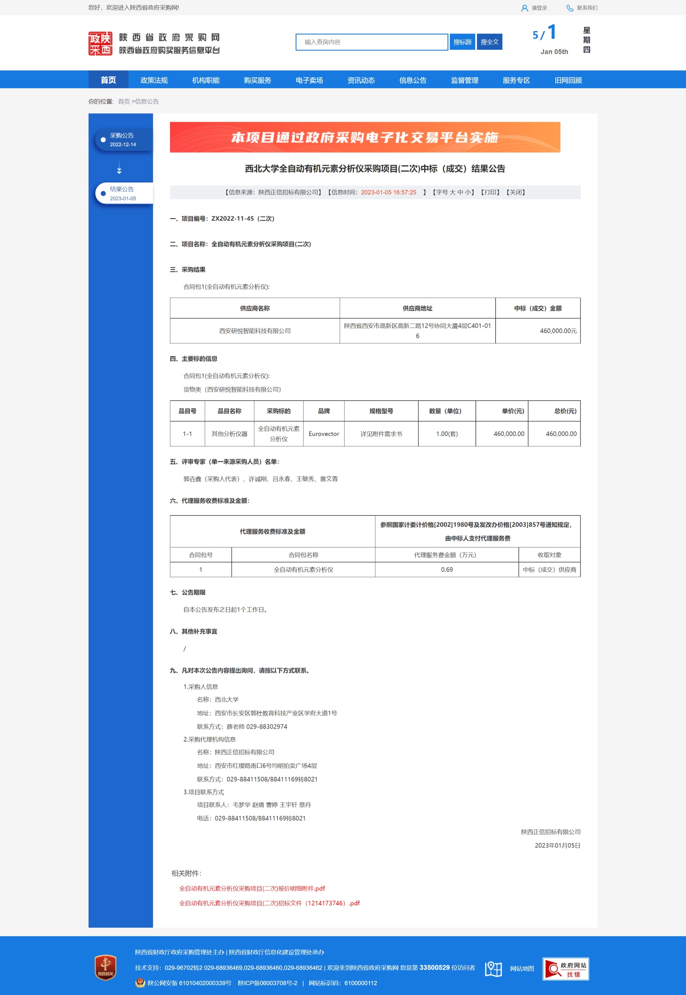 广发体育全自动有机元素分析仪采购项目(二次)中标(成交)结果公告 作者: 编辑:采购与招标办公室 时间:2023-01-05 原公告链接:http://www.ccgp-shaanxi.gov.cn/freecms/site/shaanxi/ggxx/info/2023/8a69c86f852dbe9b0185807f572a04d1.html?noticeType=001021¬iceId=b8ed0ed9-8cd7-11ed-9a8e-08c0eb20c666