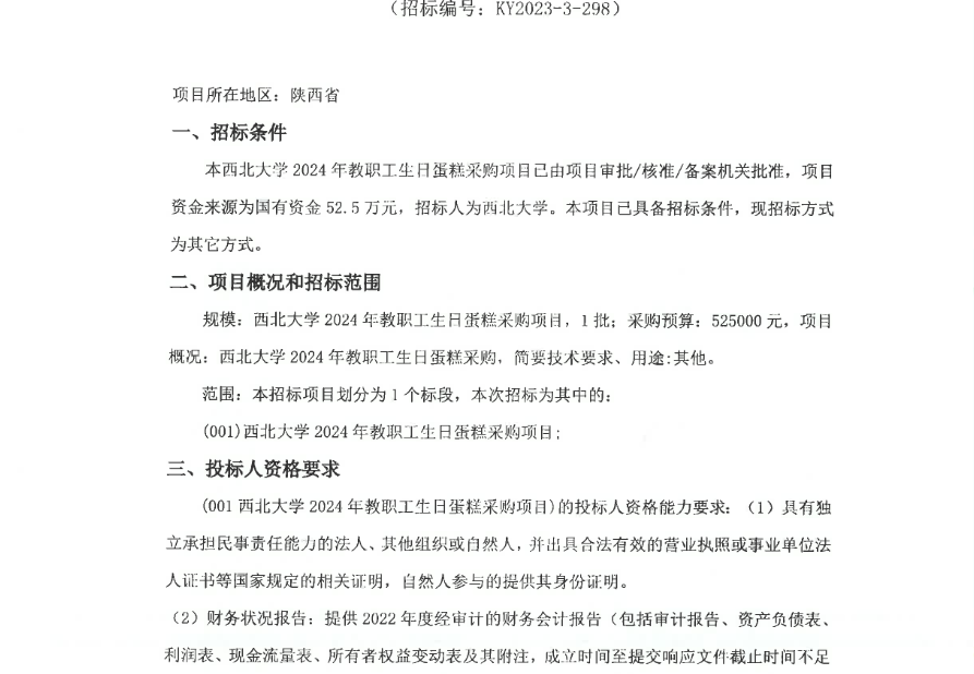 广发体育2024年教职工生日蛋糕采购项目竞争性磋商公告 作者: 编辑:采购与招标办公室 时间:2023-11-27 原公告链接:http://bulletin.sntba.com/biddingBulletin/2023-11-27/855167.html