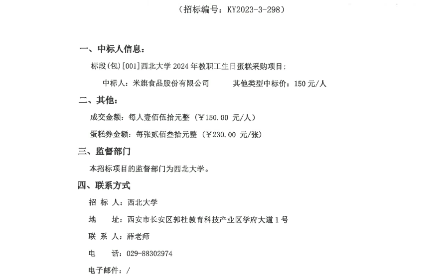 广发体育2024年教职工生日蛋糕采购项目成交公告 作者: 编辑:薛利娟 时间:2023-12-11 原公告链接:http://bulletin.sntba.com/resultBulletin/2023-12-11/900882.html