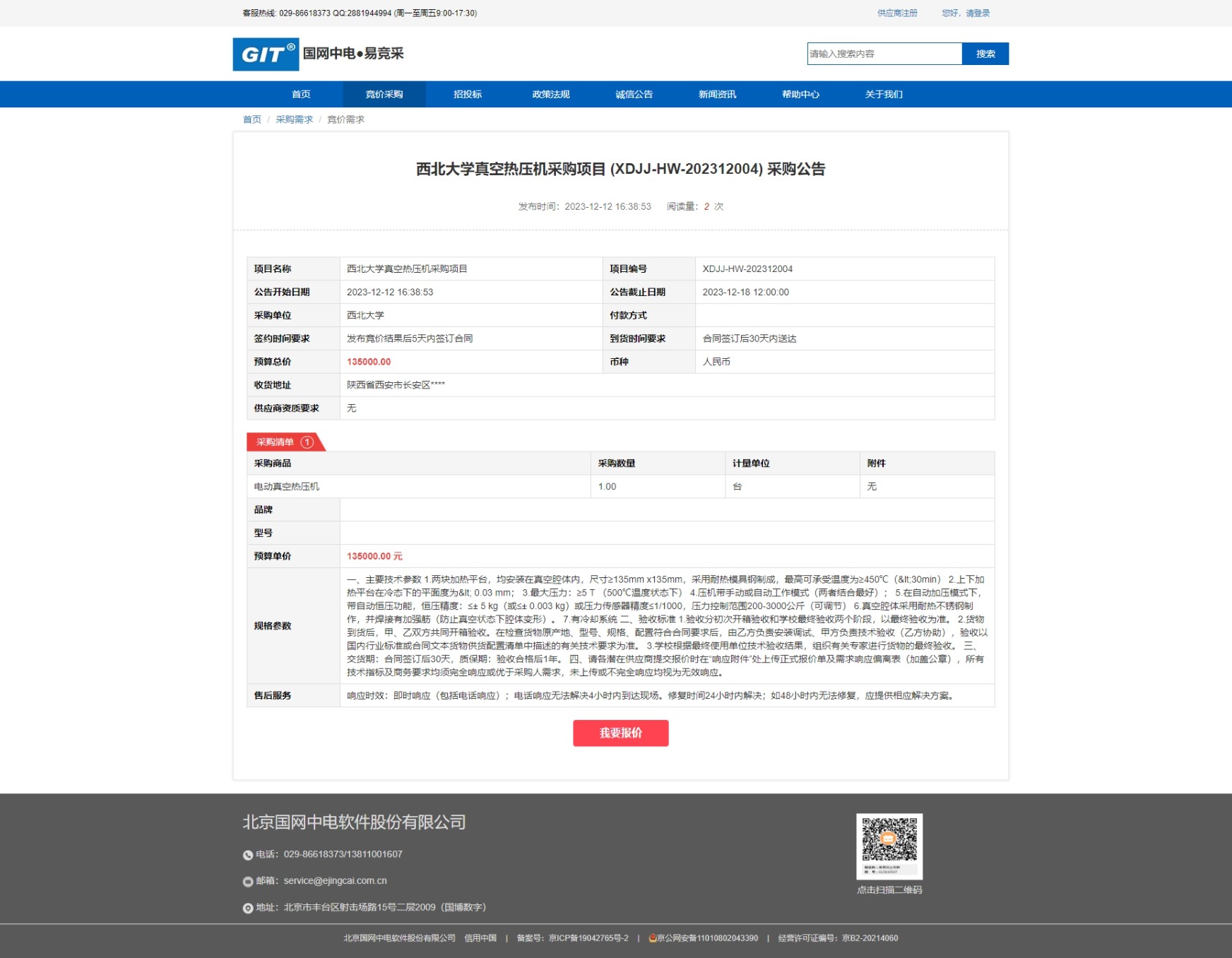 广发体育真空热压机采购项目 (XDJJ-HW-202312004) 采购公告 作者: 编辑:采购与招标办公室 时间:2023-12-12 原公告链接:https://www.ejingcai.com.cn/site/bidding/detail/7765