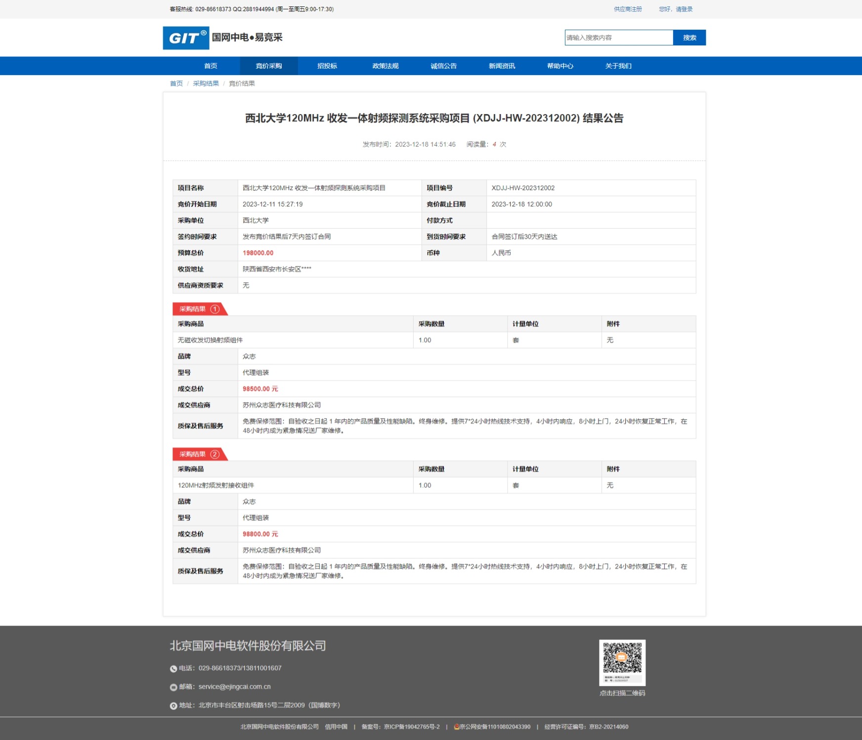 广发体育120MHz 收发一体射频探测系统采购项目 (XDJJ-HW-202312002) 结果公告 作者: 编辑:采购与招标办公室 时间:2023-12-18 原公告链接:https://www.ejingcai.com.cn/site/bidding/detail/7902