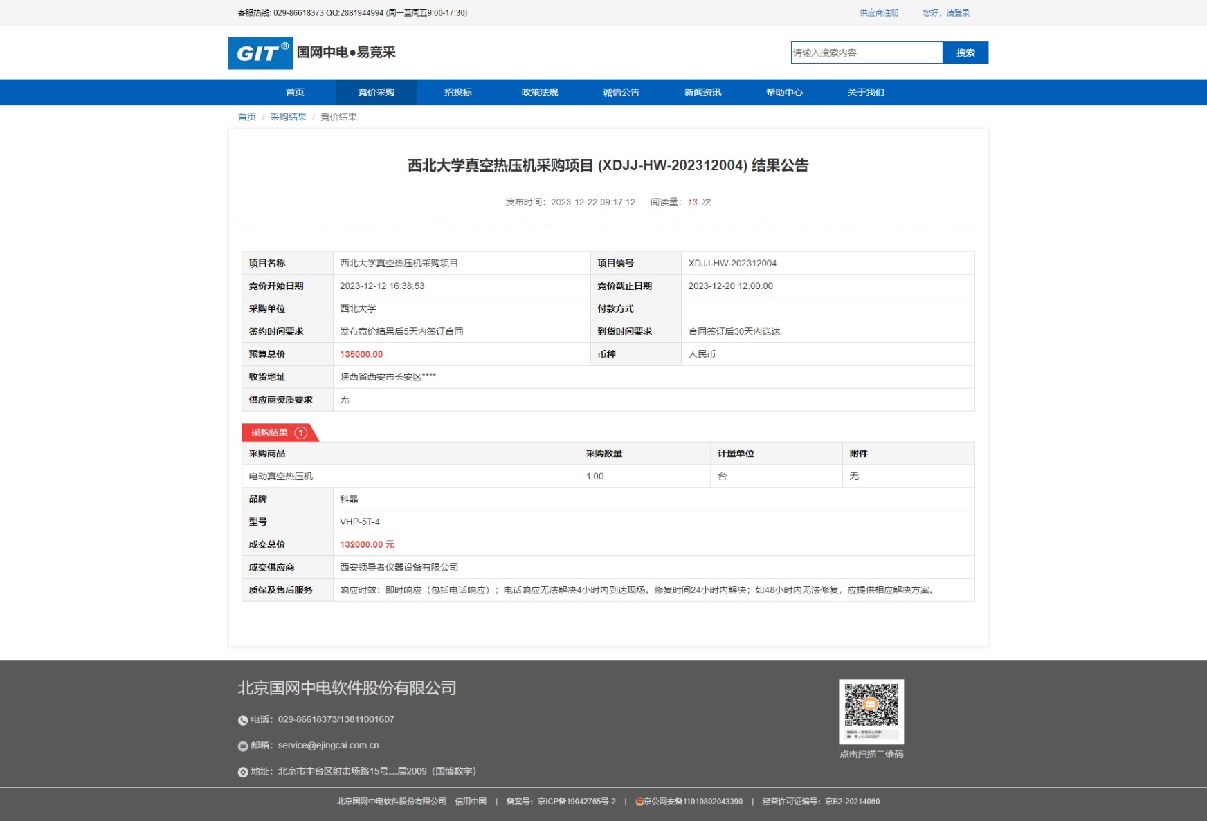 广发体育真空热压机采购项目 (XDJJ-HW-202312004) 竞价结果公告 作者: 编辑:采购与招标办公室 时间:2023-12-22 原公告链接:https://www.ejingcai.com.cn/site/bidding/detail/7982