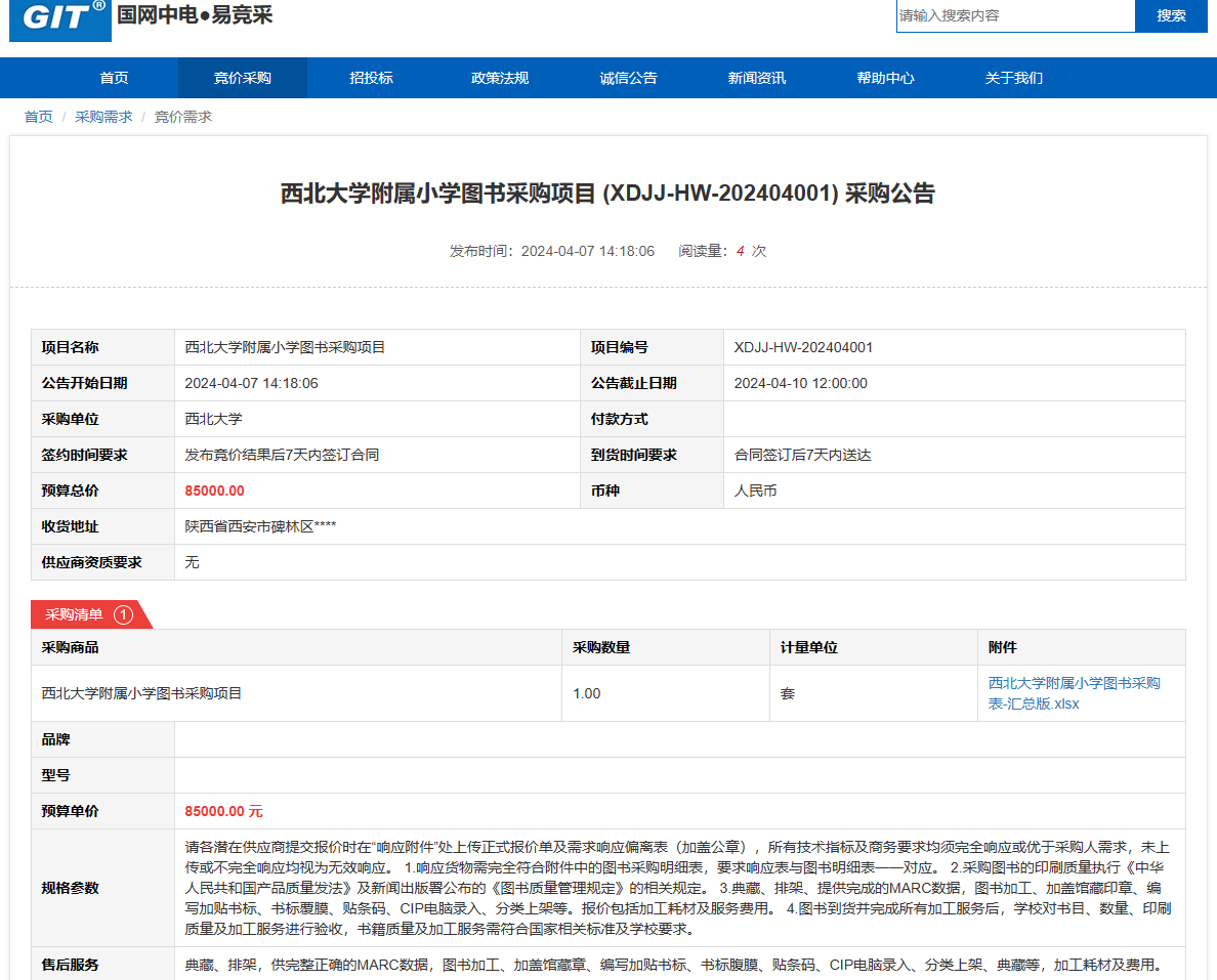 广发体育附属小学图书采购项目 (XDJJ-HW-202404001) 竞价公告 作者: 编辑: 时间:2024-04-07 原公告链接:https://www.ejingcai.com.cn/site/bidding/detail/9303