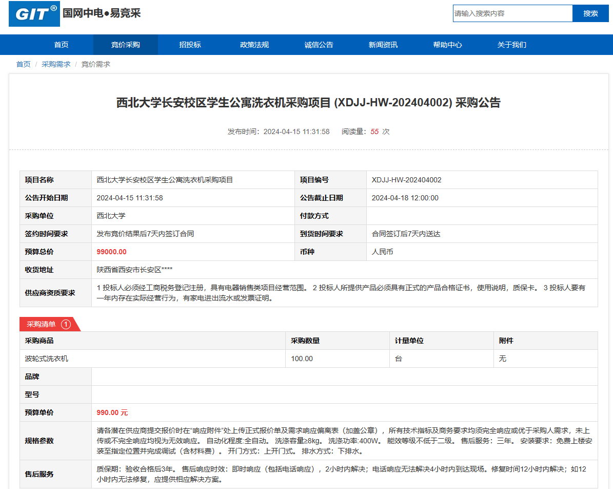 广发体育长安校区学生公寓洗衣机采购项目 (XDJJ-HW-202404002) 竞价公告 作者: 编辑: 时间:2024-04-16 原公告链接:https://www.ejingcai.com.cn/site/bidding/detail/9485