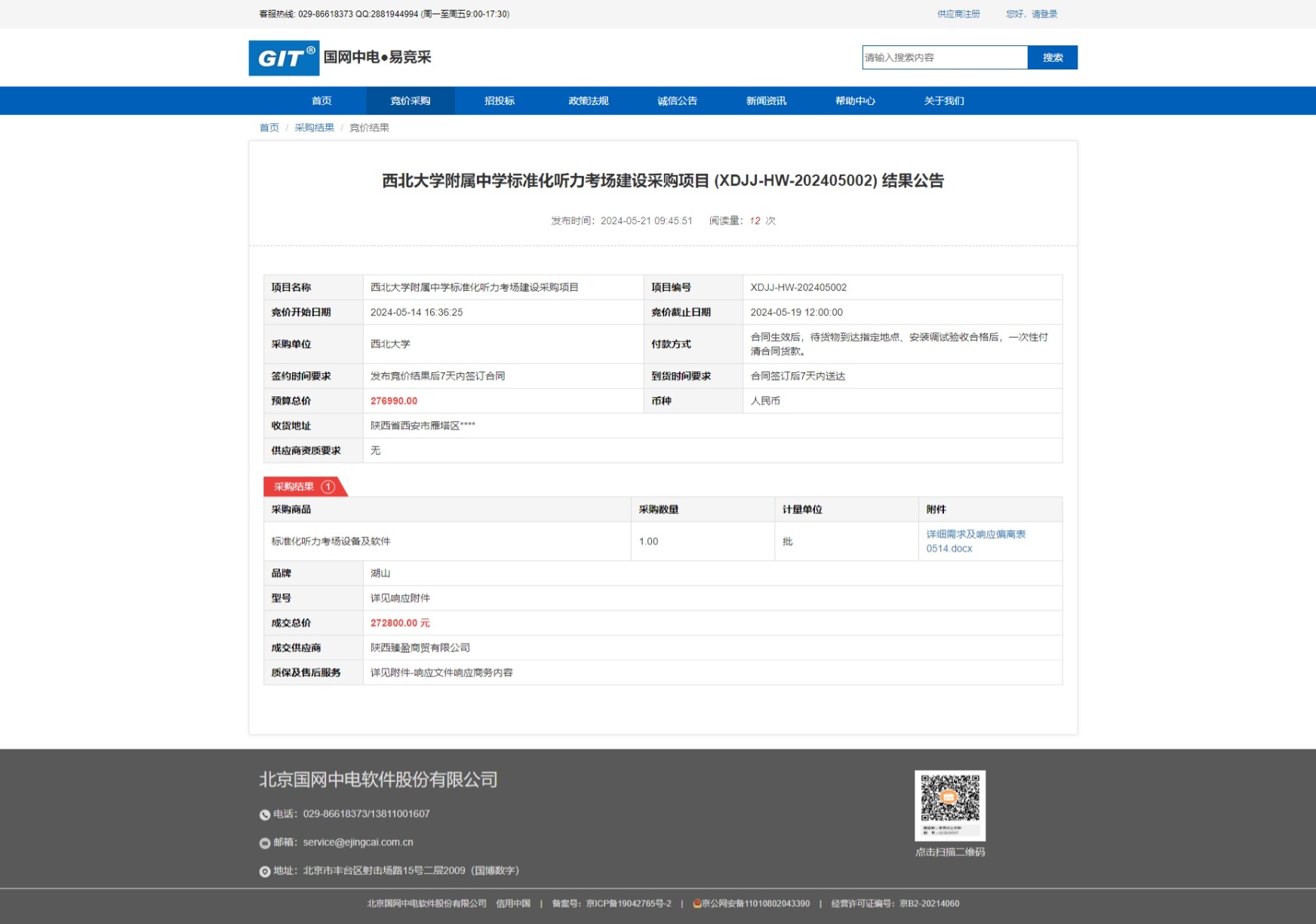 广发体育附属中学标准化听力考场建设采购项目 (XDJJ-HW-202405002)竞价 结果公告 作者: 编辑:采购与招标办公室 时间:2024-05-21 原公告链接:https://www.ejingcai.com.cn/site/bidding/detail/10341
