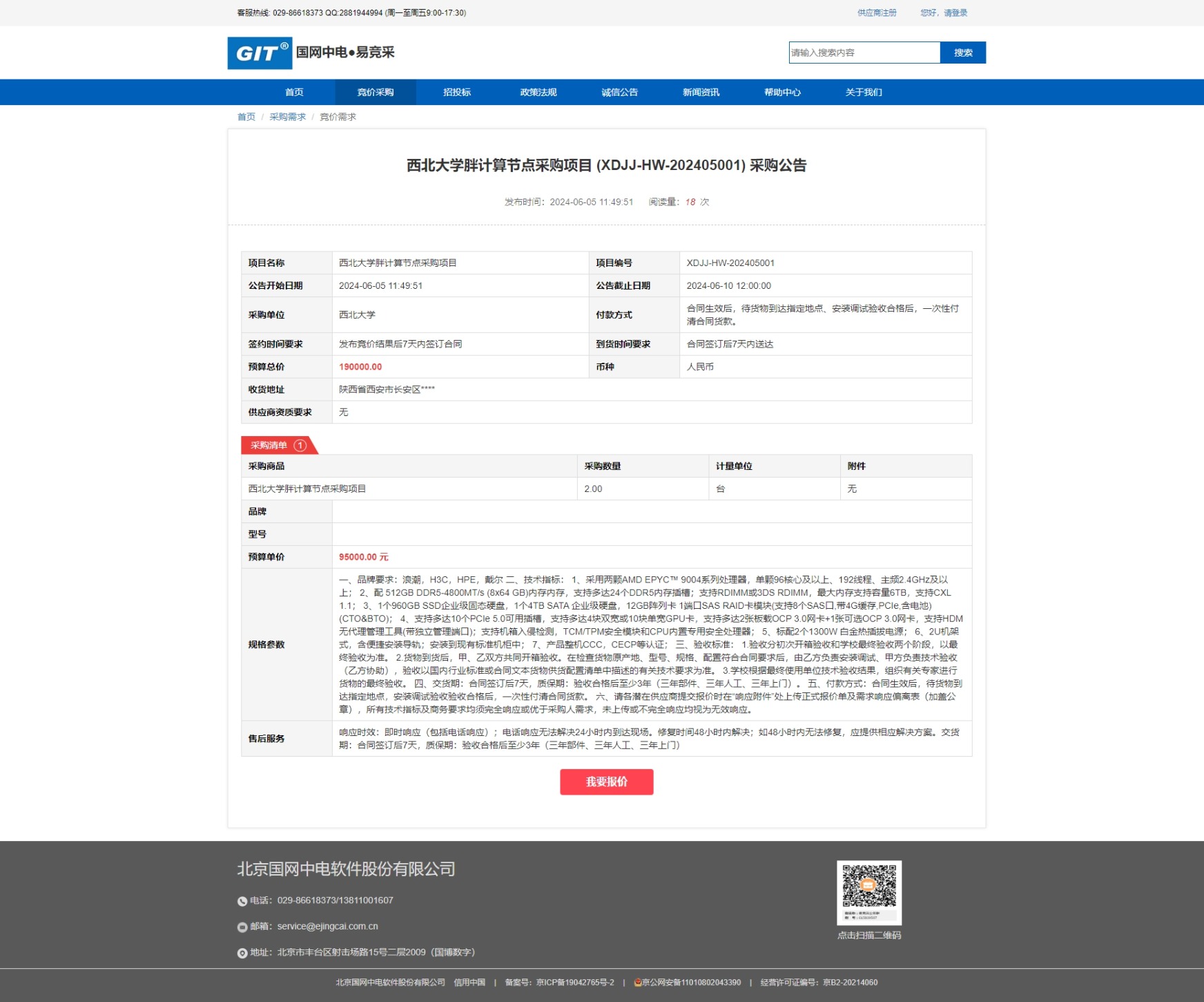 广发体育胖计算节点采购项目 (XDJJ-HW-202405001) 采购公告 作者: 编辑:采购与招标办公室 时间:2024-06-05 原公告链接:https://www.ejingcai.com.cn/site/bidding/detail/10763