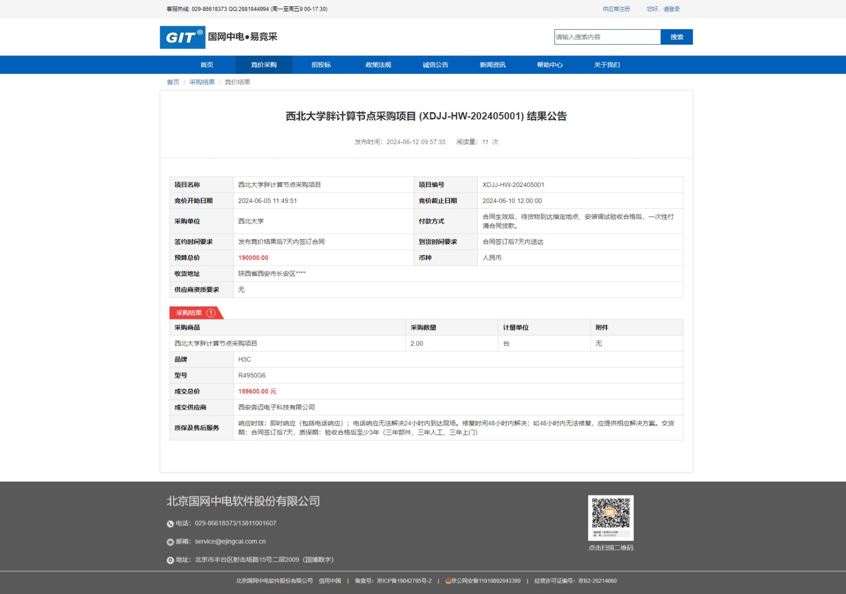 广发体育胖计算节点采购项目 (XDJJ-HW-202405001)竞价结果公告 作者: 编辑:采购与招标办公室 时间:2024-06-12 原公告链接:https://www.ejingcai.com.cn/site/bidding/detail/10930